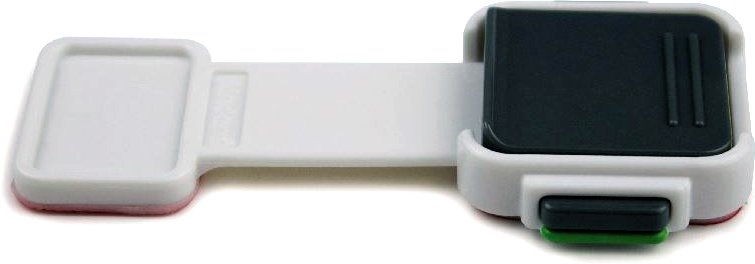 Замок виготовлений з ударостійкого пластику. Подвійна система блокування забезпечує додатковий захист. Легко встановлюється за допомогою міцних клейких накладок.