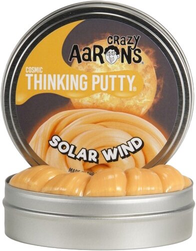 Жуйка для рук Crazy Aaron's Сонячний вітер — це щось чудове! Потоки заряджених частинок, що виходять від Сонця, можуть досягати швидкості більш ніж 450 миль за секунду й понад 2 мільйони градусів за Фаренгейтом. Жуйка для рук Crazy Aaron's Сонячний вітер повністю візуально копіює це шикарне явище, надихаючи вас на всілякі експерименти з ним. Зминайте і розтягуйте, спостерігаючи за нескінченним видовженням речовини, а потім зліпіть з неї м'яч і запустіть об стіну, він стрибатиме, як гумовий. Залиште на деякий час і подивіться, як на столі утворюється справжнісінька калюжка! А тепер різко вдарте — отримаєте безліч дрібних осколків, як від твердого предмета. А ще використовуйте зарядний пристрій і темряву для спостережень за світінням і зміною кольору.