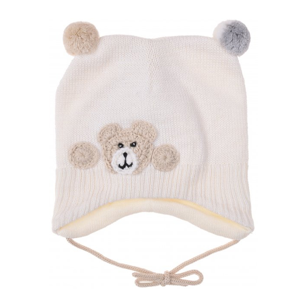 Тепла в'язана шапка для дітей 3-4 років. Склад: 50% вовна, 50% акрил. Є підкладка з 100% бавовни. Прикрашена вишивкою у вигляді мордочки ведмедика. Має зав'язки для фіксації на голові, вітрозахисні вкладиші-мембрани, помпони "вушка". Розмір - 50.