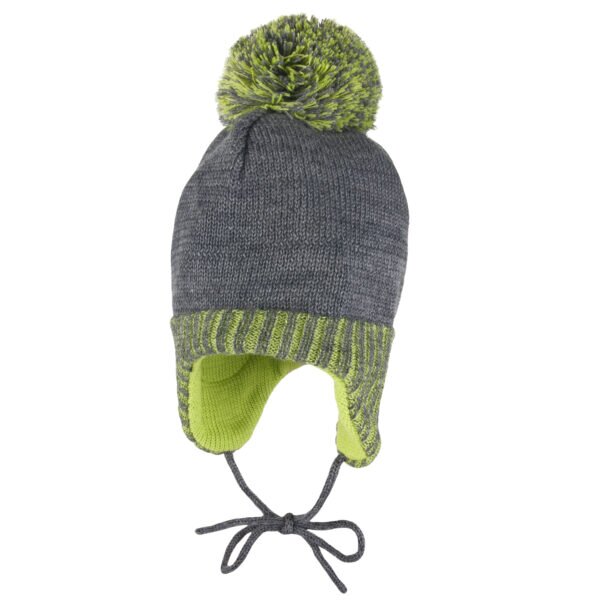 Тепла в'язана шапка для хлопчиків 3-х років. Склад: 50% вовна, 50% акрил. Є підкладка з 100% бавовни. Прикрашена помпоном. Має зав'язки для фіксації на голові, вітрозахисні вкладиші-мембрани. Розмір - 50.