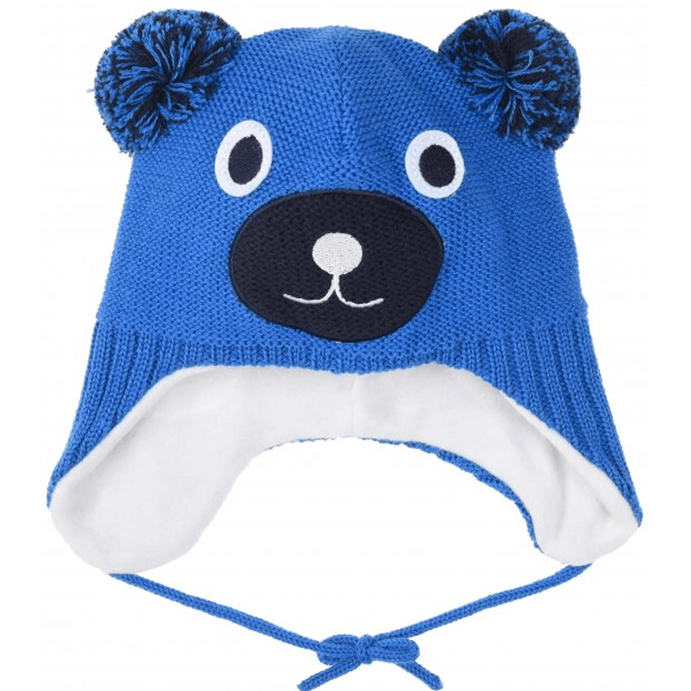 Тепла в'язана шапка для хлопчиків 1-2 років. Склад: 50% вовна, 50% акрил. Є підкладка з 100% бавовни. Прикрашена аплікацією у вигляді мордочки ведмедика. Має зав'язки для фіксації на голові, вітрозахисні вкладиші-мембрани, помпони "вушка". Розмір - 48.