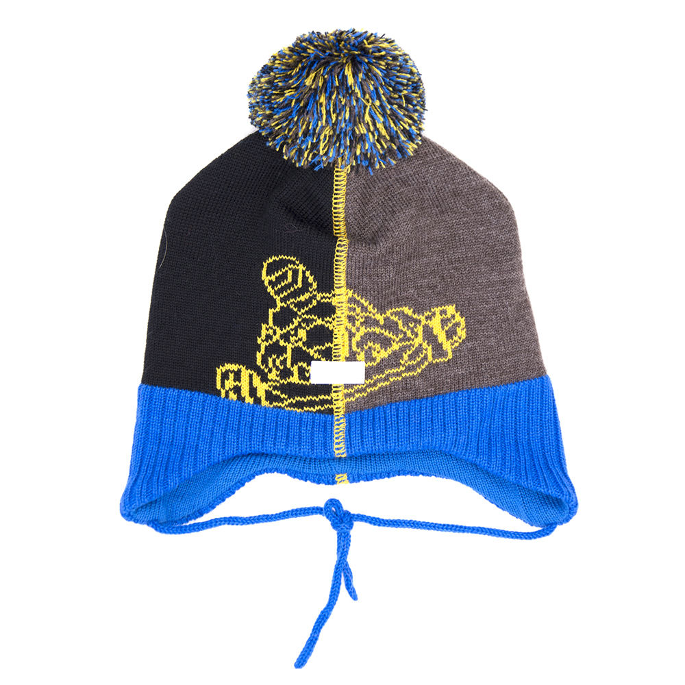 Тепла в'язана шапка для хлопчиків 1-2 років. Склад: 50% вовна, 50% акрил. Є підкладка з 100% бавовни. Прикрашена помпоном. Має зав'язки для фіксації на голові, вітрозахисні вкладиші-мембрани. Розмір - 48.