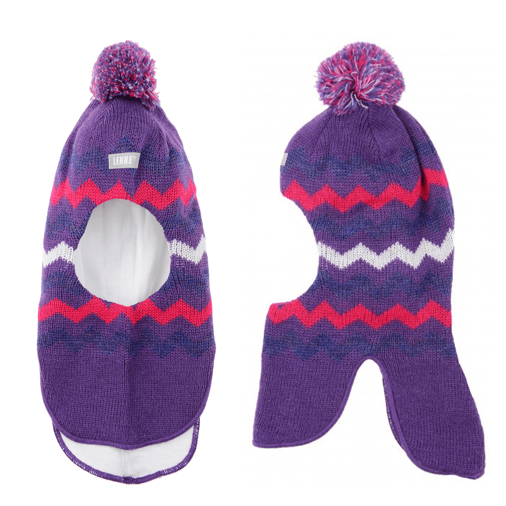 Тепла в'язана шапка "шолом" для дівчаток 1-2 років. Добре захищає від вітру вушка та шию дитини. Склад: 100% вовна. Є підкладка з 100% бавовни. Прикрашена кольоровими смужками та помпоном. Розмір - 48.