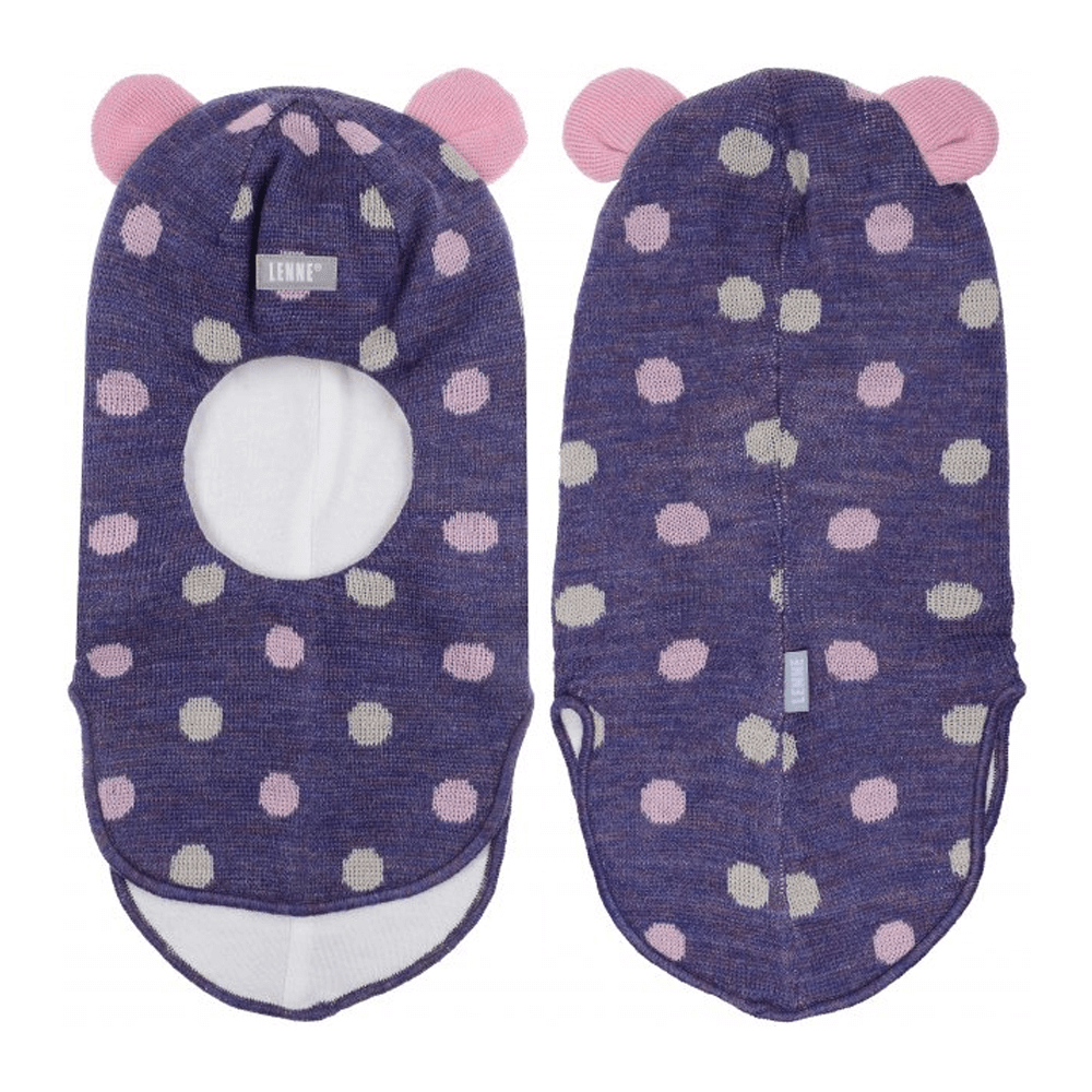 Тепла в'язана шапка "шолом" для дівчаток від 3 до 4 років. Добре захищає від вітру вушка та шию дитини. Склад: 100% вовна. Є підкладка з 100% бавовни. Прикрашена рожевими "вушками" та принтом "горох". Розмір - 52.