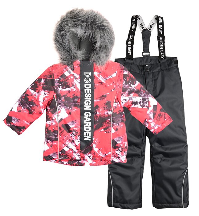 Теплий комплект Garden Baby (Гарден Бебі), що складається з куртки та напівкомбінезона, для дівчинки на 1,5 року. Пошитий з мембранної тканини. Є захист від вітру та снігу, світловідбиваючі елементи. Утеплювач - термолофт 200, 100% поліестер. Флісова підкладка. Водостійкість верхньої тканини - 5000 мм, паропроникність - 5000 г/м²/24 год. Капюшон на регульованій застібці. Забарвлення куртки - червона абстракція. Напівкомбінезон - чорний, з регульованими підтяжками.