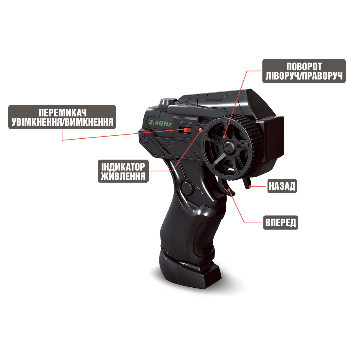 - живлення - 2 батарейки типу АА для пульта керування (в комплект не входять), 3 батарейки типу АА для машинки (в комплект не входять).