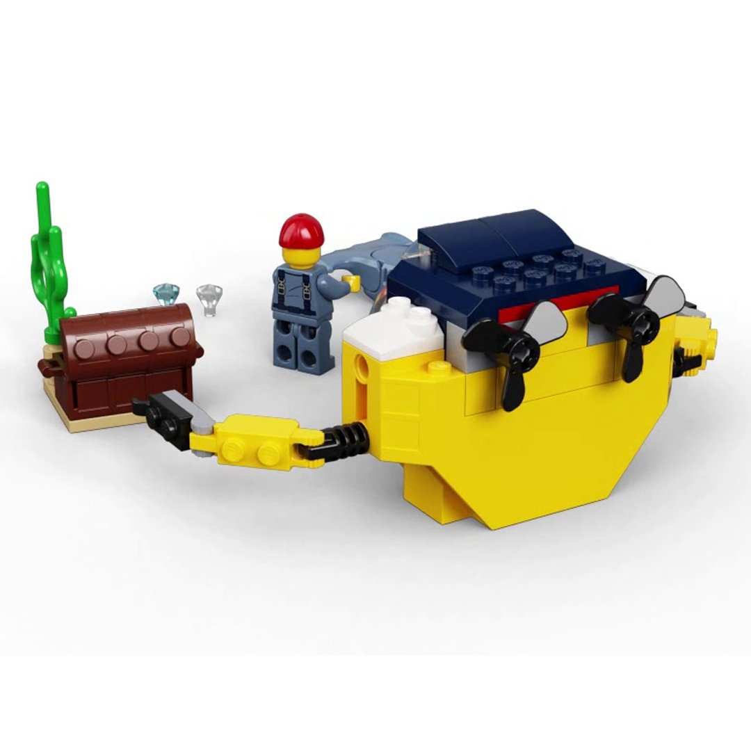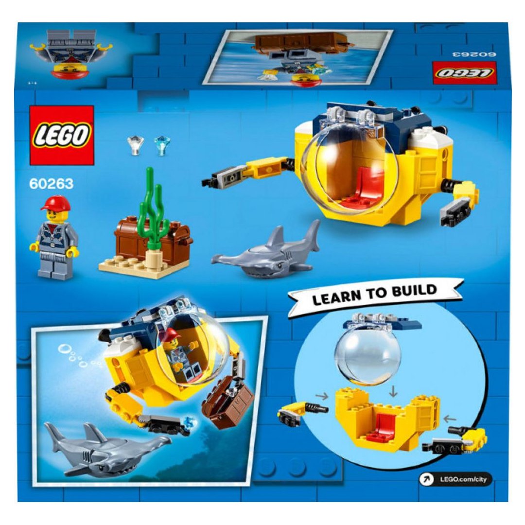 Відправляйтеся на пошуки затонулих скарбів з конструктором LEGO City! Ігровий набір рекомендований дітям від 4 років. Включає 41 деталь для складання дослідницької субмарини і океанського дна з піратською скринею. Іграшка продумана до дрібниць: в комплекті, крім підводного судна, є акула з рухомою щелепою і фігурка вченого. З тематичними конструкторами "Лего" не буває нудно! Вони виготовлені з міцного, безпечного і яскравого пластика. Елементи з'єднуються за допомогою шипів і пазів, що забезпечує міцність конструкції. Гра формує будівельні навички дитини, розвиває уважність, логіку, дрібну моторику і фантазію. Конструктором можна грати під час купання. Артикул 124467.