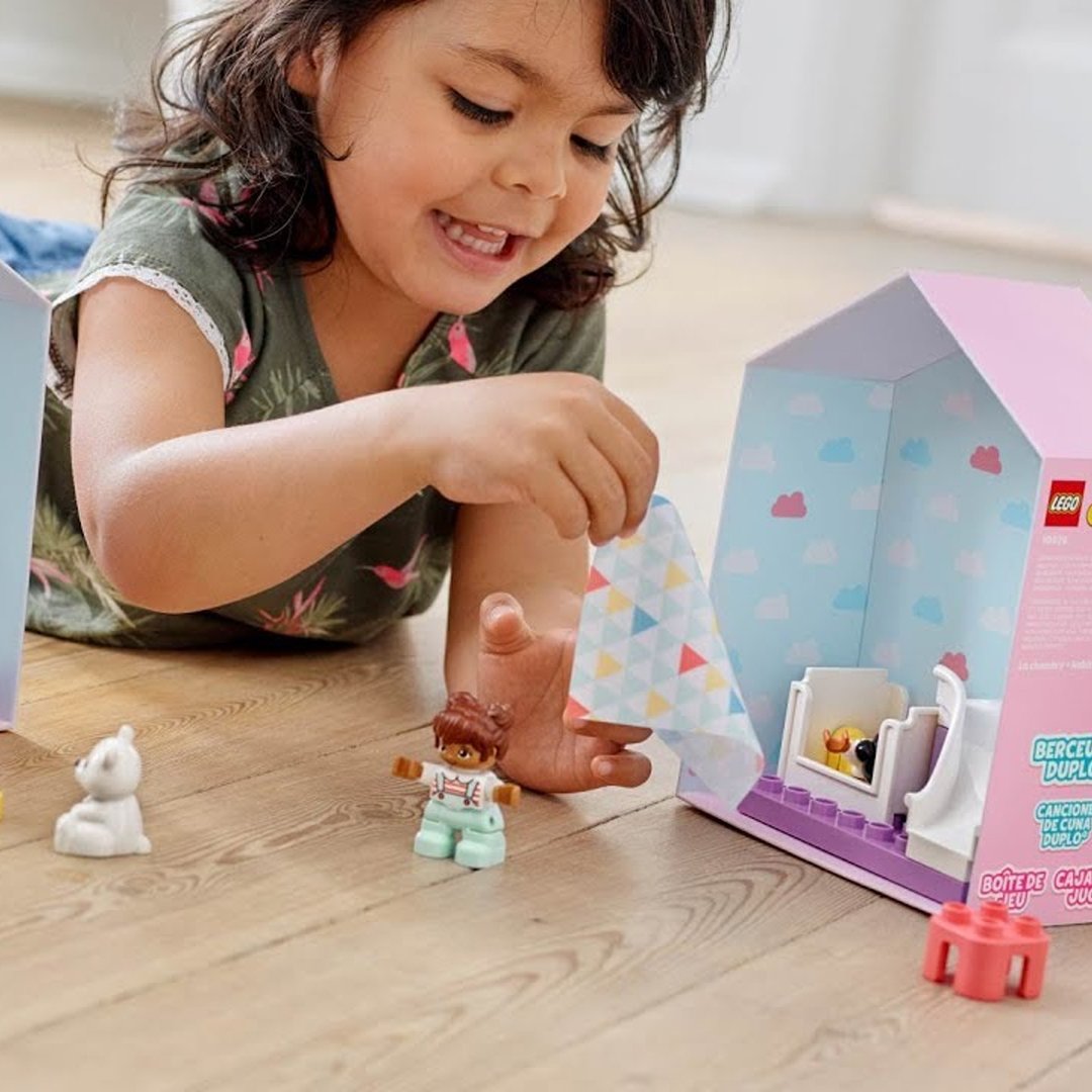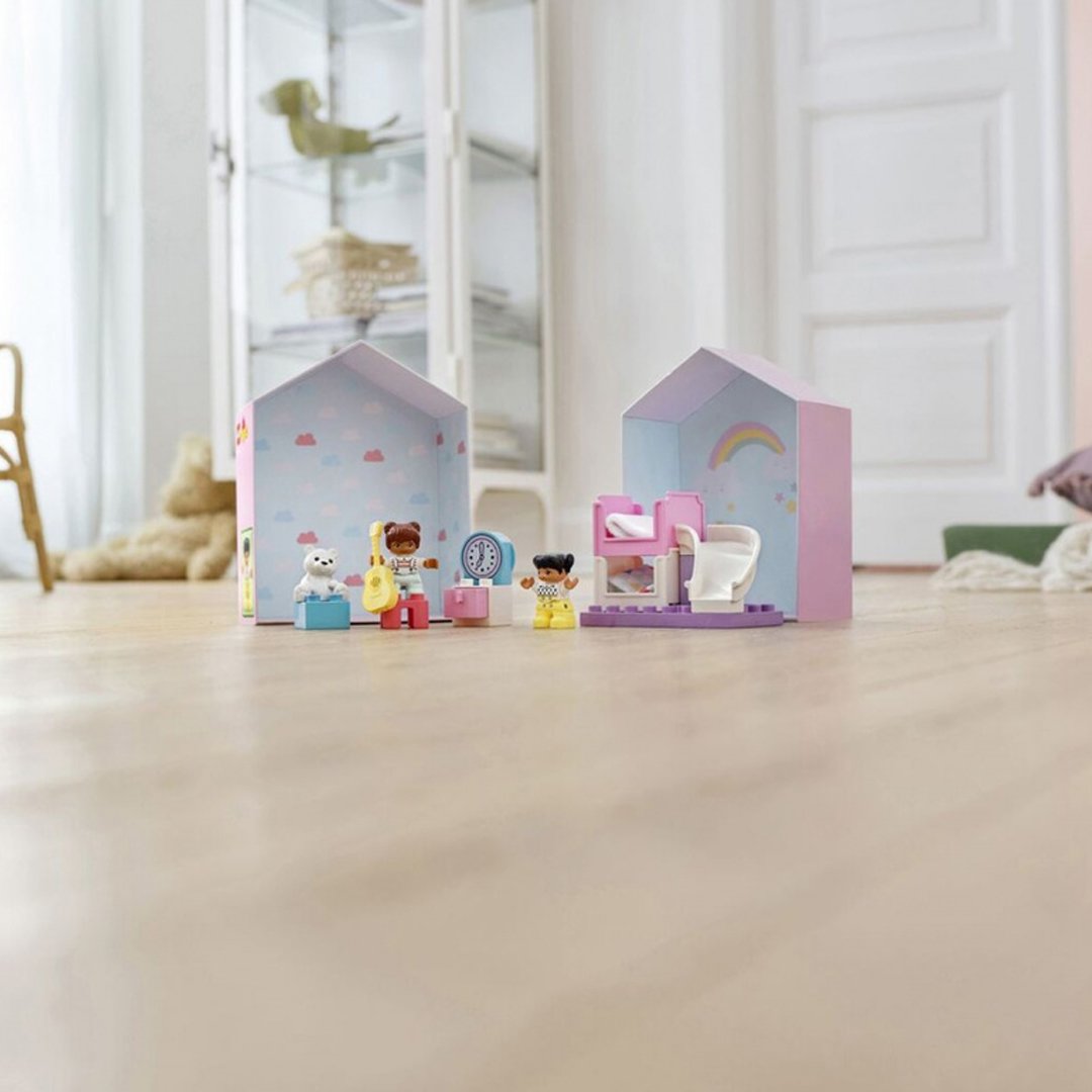 Придумуйте життєві історії з конструктором LEGO® DUPLO®! Ігровий набір розроблений для дітей 2-5 років. Складається з 16 великих барвистих блоків. З них можна зібрати двоярусне ліжко з гіркою і коммод з годинником. Іграшка продумана до дрібниць: в комплекті є стільчик, гітара і три фігурки - двох маленьких дівчаток і білого ведмедика. Конструктор для самих маленьких розвиває дрібну моторику, формує початкове вміння будувати. В процесі гри малюк вчиться взаємодіяти з навколишнім світом, створювати уявні ситуації. Нехай малюк укладає лялечок спати, розповідає їм казки, співає колискові. Невеликими за розміром фігурками зручно грати: вони поміщаються в дитячу долоньку. А шипове з'єднання спрощує збірку конструкції. Артикул 124443.