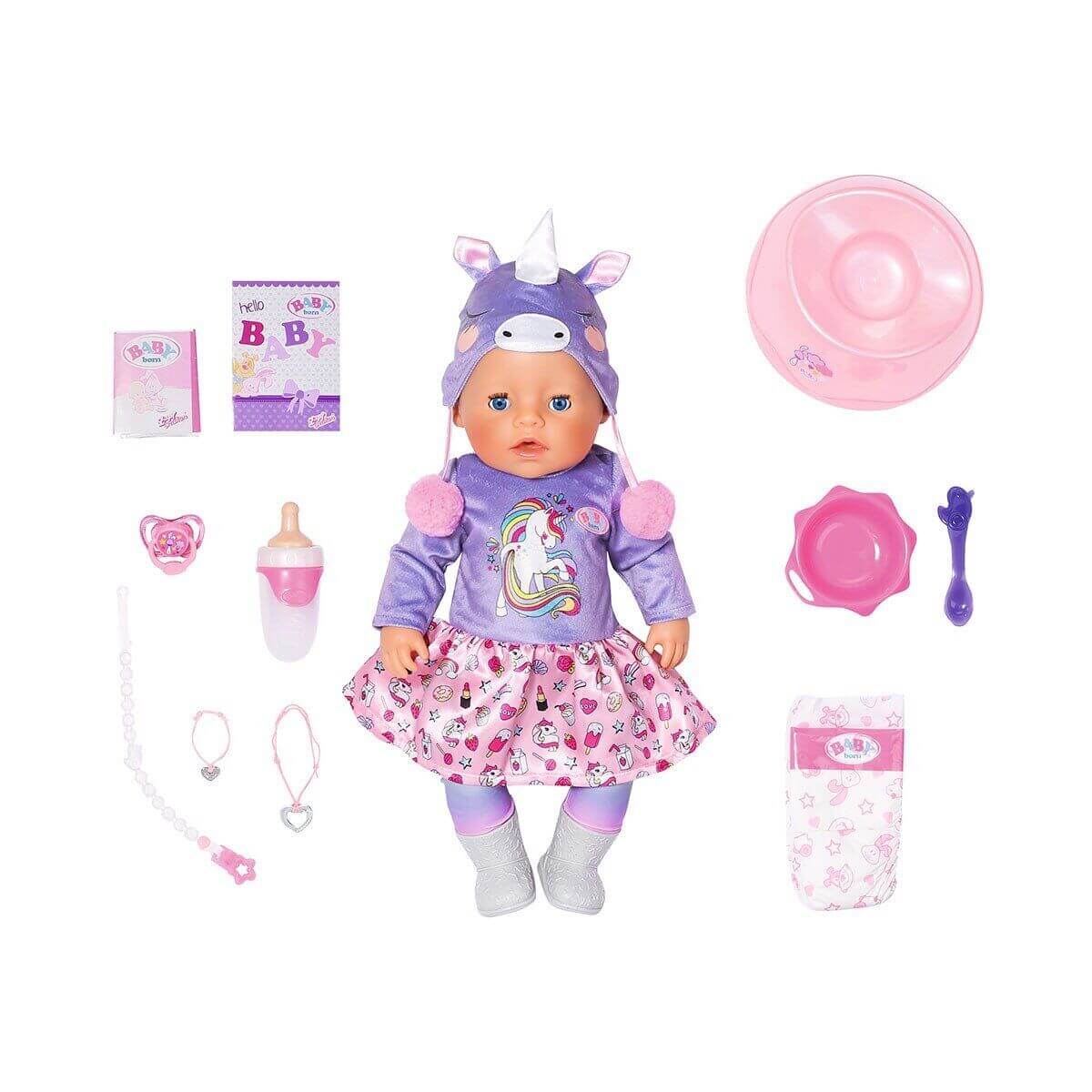 Функціональність: п'є з пляшки, їсть кашу, мочить підгузник, ходить на горщик, плаче справжніми сльозами, закриває очі, має рухливі ручки і ніжки. З нею можна купатися. У комплект входить: лялька заввишки 43 см, 1 порція каші, тарілочка з ложкою, підгузник, пустушка, горщик, ланцюжок до пустушки, пляшечка, браслети, ID-картка. Рекомендовано для дітей старше 3 років.