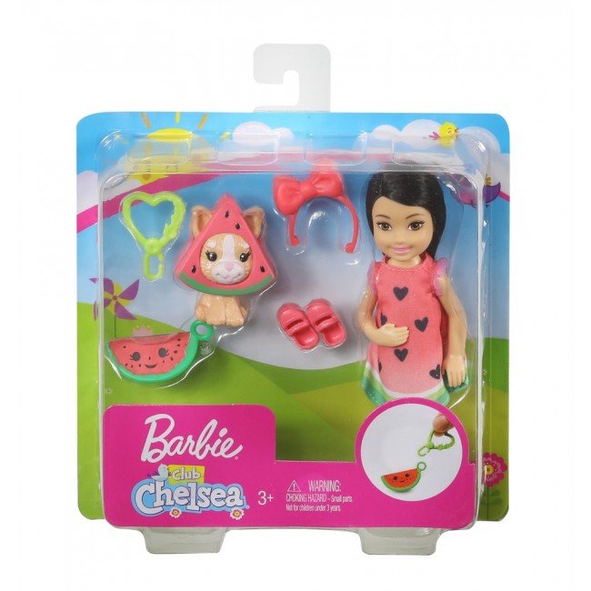 Лялька Челсі та її друзі надихають дітей пізнавати світ. Як і старшій сестрі Barbie, їй подобається вигадувати щось нове, випробовувати себе і веселитися. Діти можуть розіграти безліч кумедних історій з ляльками Челсі в модних костюмах! Виберіть костюм єдинорога, кавуна або кішки. Кожна лялька має на голові обруч, і з нею в наборі йде тварина з аксесуаром, який повторює стиль одягу Челсі, що дає можливість дітям вигадувати різноманітні історії. Брелок із цього набору дозволяє легко прикріпити ляльку Челсі до рюкзака або одягу, тому дитина може пограти з лялькою зі своїми друзями! Дітям дуже сподобається розігрувати великі історії з маленькими ляльками. Зберіть колекцію ляльок і отримаєте ще більше задоволення від гри (кожна лялька продається окремо, за наявності). Кольори і аксесуари можуть відрізнятися.