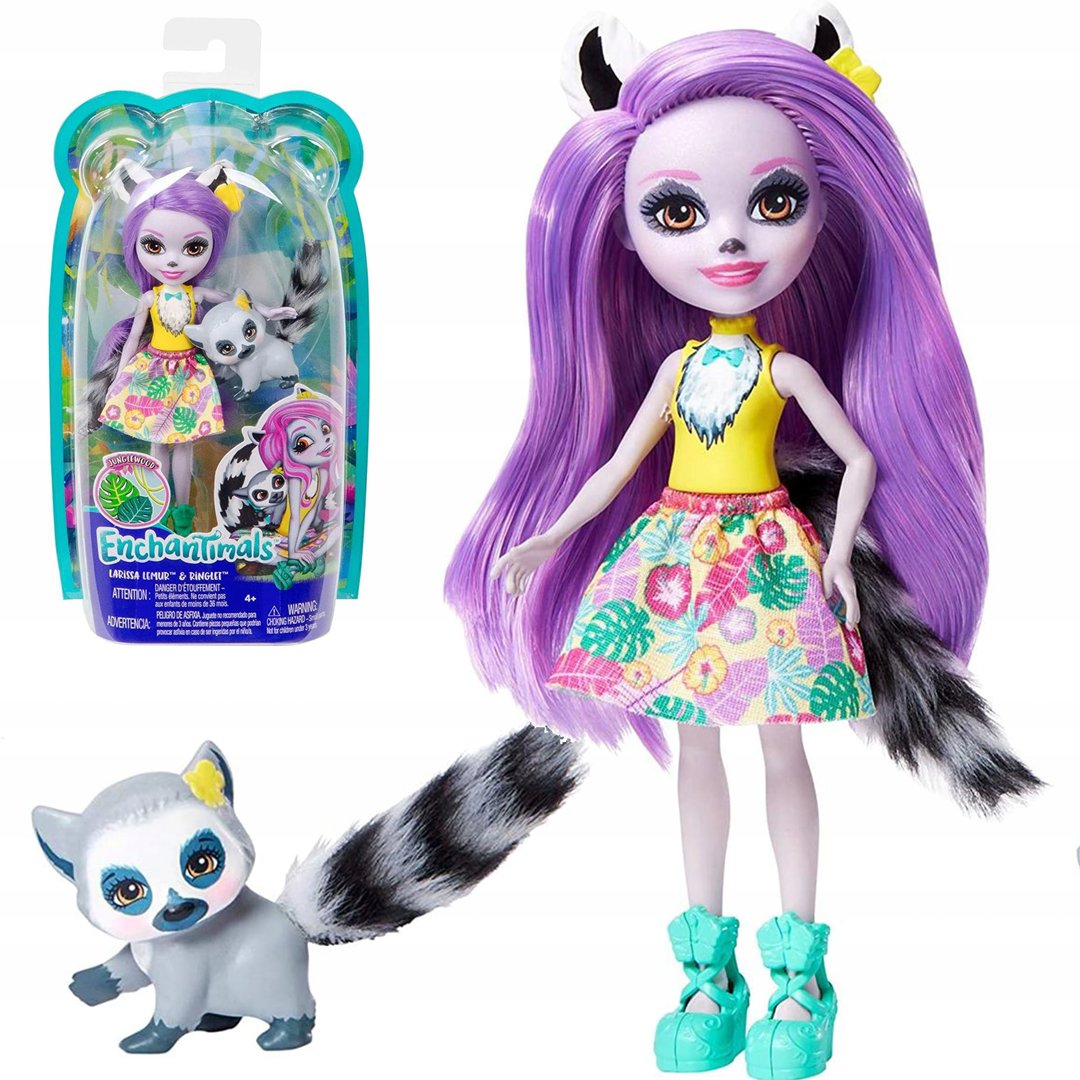 Чудовий подарунок шанувальнику мультика “Енчантімалс”. Піклування - це наше призвання! Іграшку створено для дітей 4-8 років. У комплекті з дівчинкою-перевертнем йде улюбленець - лемур Рінглет. Лялька Лариса заввишки 15 см виготовлена з якісного міцного пластику. Має довге фіолетове волосся та детально промальоване обличчя. На звірину іпостась дівчини вказують вушка та хвостик, чорний ніс, намальовані навколо очей плями. Лялька одягнена у жовтий топ та пишну спідницю. Вбрання прикрашає тропічний принт. На ногах дівчини - бірюзові високі черевики з квітами-застібками. Гра з ляльками Enchantimals вчить дитину піклуватися про тварин, розвиває фантазію та дрібну моторику. Артикул 792373.