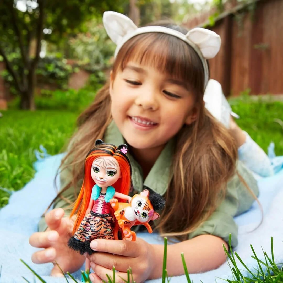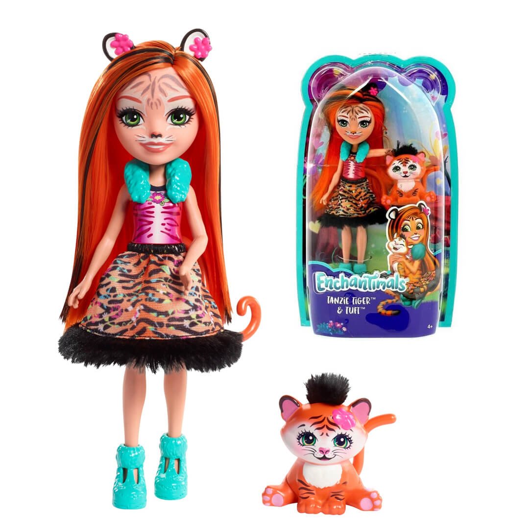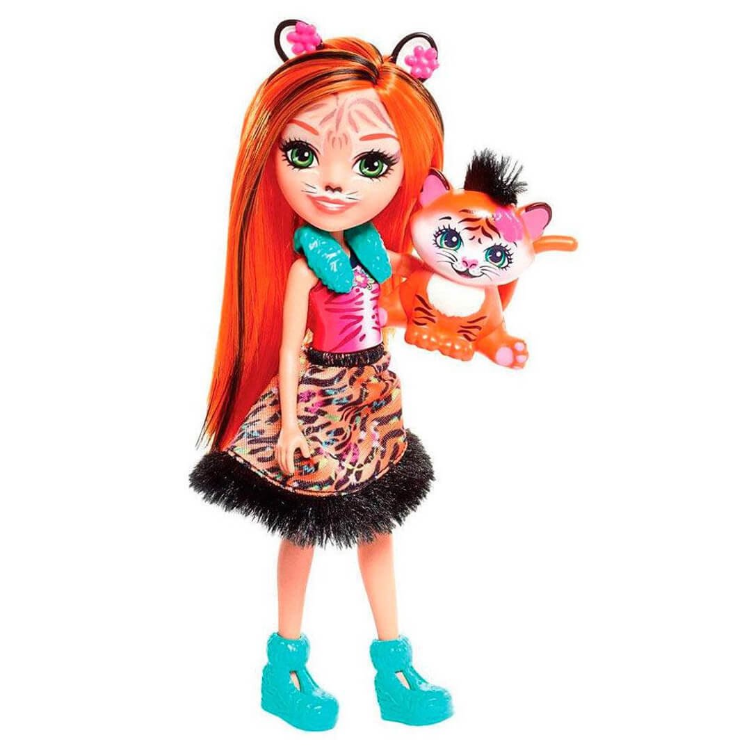 Чудовий подарунок шанувальнику мультика “Енчантімалс”. Піклування - це наше призвання! Іграшку створено для дітей 4-8 років. У комплекті з дівчинкою-перевертнем йде улюбленець - тигреня Тафт. Лялька Тензі заввишки 15 см виготовлена з якісного міцного пластику. Має довге руде волосся з чорними пасмами, детально промальоване обличчя. На звірину іпостась дівчини вказують уквітчані тигрові вушка, чорний носик, малюнок на обличчі, що імітує шерсть. Лялька одягнена у яскраво-рожевий топ та світло-коричневу пишну спідницю. Вбрання прикрашає анімалістичний принт. По низу спідниці йде бахрома. На ногах дівчини - бірюзові черевики на платформі. Гра з ляльками Enchantimals вчить дитину піклуватися про тварин, розвиває фантазію та дрібну моторику. Артикул 788418.
