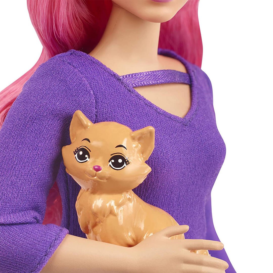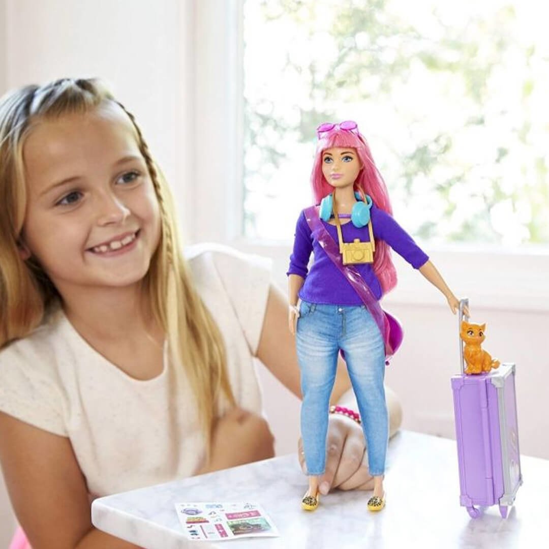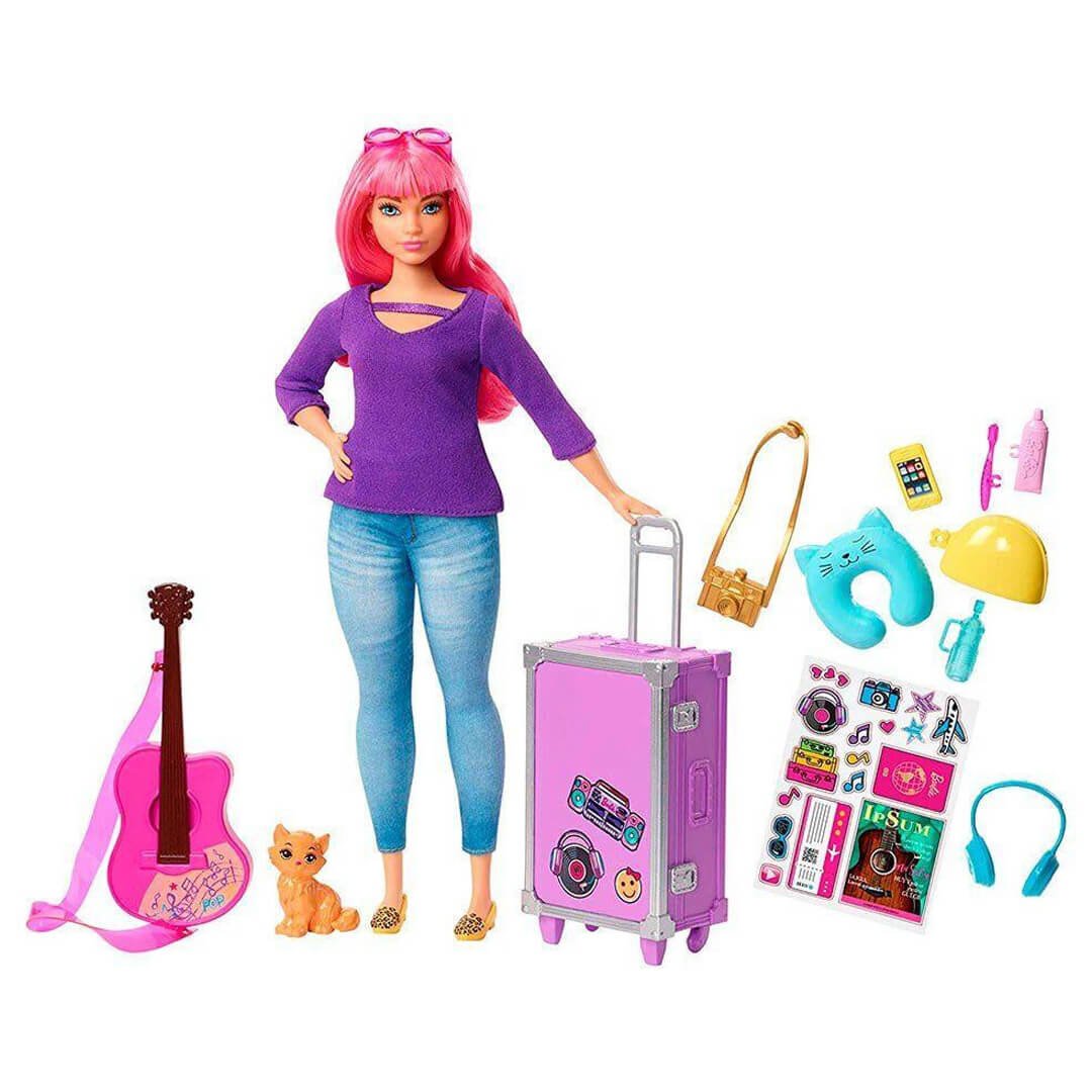 Вирушайте у світ неймовірних пригод з Дейзі! Іграшка створена для дітей від 3-х років. До комплекту з лялькою входять: кошеня, гітара з ремінцем, валіза на коліщатках, 9 тематичних аксесуарів та наліпки. Дейзі одягнена у фіолетовий джемпер та трохи потерті джинси-скінні. На ногах дівчини - жовті туфлі-човники зі звіриним принтом. Лялька заввишки 29 см виготовлена з якісного безпечного матеріалу. Має рухливі руки та ноги, повертає голову. У Дейзі довге рожеве волосся з чубчиком, виразні блакитні очі. Що знадобиться дівчині в дорозі? Звичайно, смартфон, косметичка, зубна паста та щітка, фотоапарат, пляшка з водою. Щоб подорож у літаку чи автобусі була комфортною, ляльці потрібна подушечка під готову та навушники слухати улюблену музику. Всі необхідні речі можна скласти у велику бузкову валізу. Гра з лялькою Дейзі розвиває естетичний смак та фантазію. Артикул 794563.