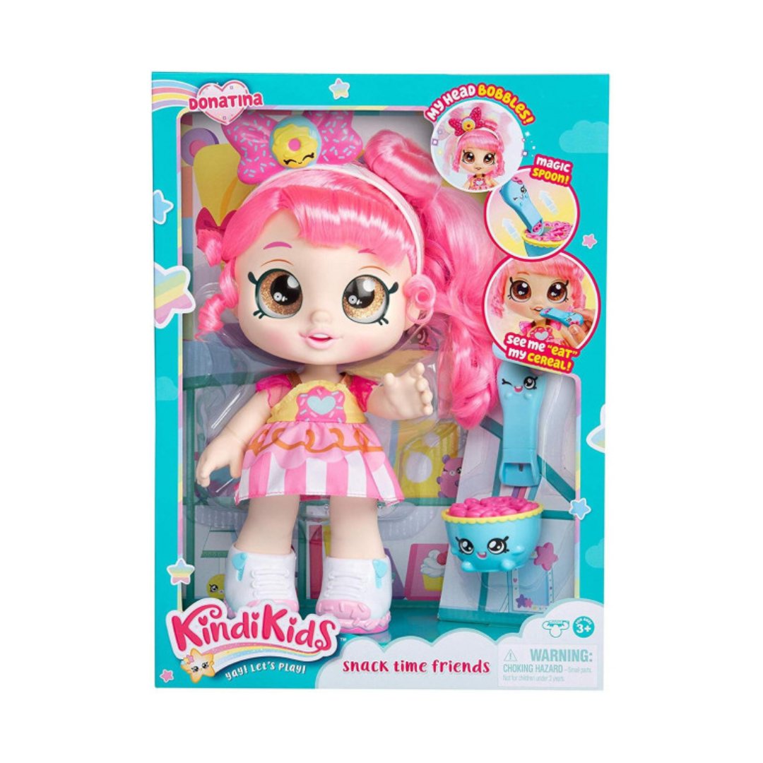 Час пригощати подружку Донатіну! Лялька створена для дошкільнят (від 3-х років). В комплекті з нею йдуть аксесуари - ложечка та тарілка зі сніданком. Лялька заввишки 25 см має приємне на дотик рожеве волосся та величезні мерехтливі карі очі з блискітками. Увесь її образ - це нагадування про смачний пундик з полуничною глазур’ю. Лялька хитає головою, має рухливі кінцівки та здатна утримувати предмети. Чудовою механікою вона завдячує особливій продуманій конструкції. Для цієї інтерактивної іграшки не потрібні батарейки! Донатіна хоче, щоб її нагодували кукурудзяними кільцями. Гра з лялькою Кінді Кідс розвиває увагу, фантазію, дрібну моторику. Дитина вчиться піклуватися, виконувати повсякденні завдання. Артикул 1027.
