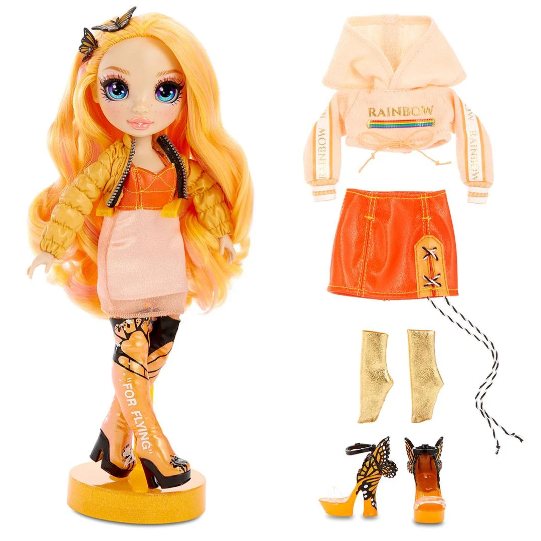 • Зустрічайте нових модних кольорових ляльок. Rainbow High - це яскрава школа моди, де всі хочуть показати свої найкращі таланти. Ці неймовірні красуні підкорять серця всіх дівчат: вони стильні, яскраві та не бояться показати справжніх себе. У ляльок неймовірні скляні очі зі «справжніми» віями. Довге розкішне волосся можна розчісувати і створювати нові зачіски. 2 набори одягу для лялечки: обери, який з них тобі більше подобається сьогодні. У ляльок є точки артикуляції: коліна, лікті та зап'ястя. Кожна лялька представляє її улюблений колір веселки - збери усіх 6 подружок Rainbow High. До набору входять: лялька, 2 набори одягу, 2 пари взуття, гребінець, аксесуар, 2 вішалки, підставка.