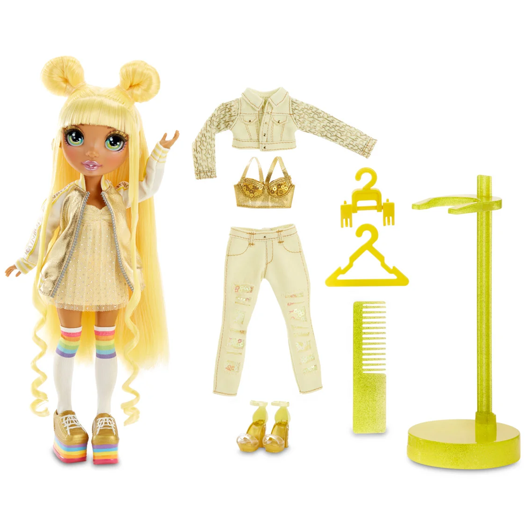 • Зустрічайте нових модних кольорових ляльок. Rainbow High - це яскрава школа моди, де всі хочуть показати свої найкращі таланти. Ці неймовірні красуні підкорять серця всіх дівчат: вони стильні, яскраві та не бояться показати справжніх себе. У ляльок неймовірні скляні очі зі «справжніми» віями. Довге розкішне волосся можна розчісувати і створювати нові зачіски. 2 набори одягу для лялечки: обери, який з них тобі більше подобається сьогодні. У ляльок є точки артикуляції: коліна, лікті та зап'ястя. Кожна лялька представляє її улюблений колір веселки - збери усіх 6 подружок Rainbow High. До набору входять: лялька, 2 набори одягу, 2 пари взуття, гребінець, аксесуар, 2 вішалки, підставка.