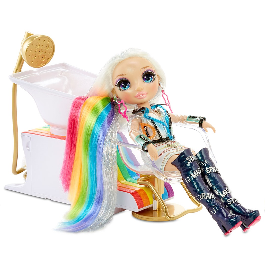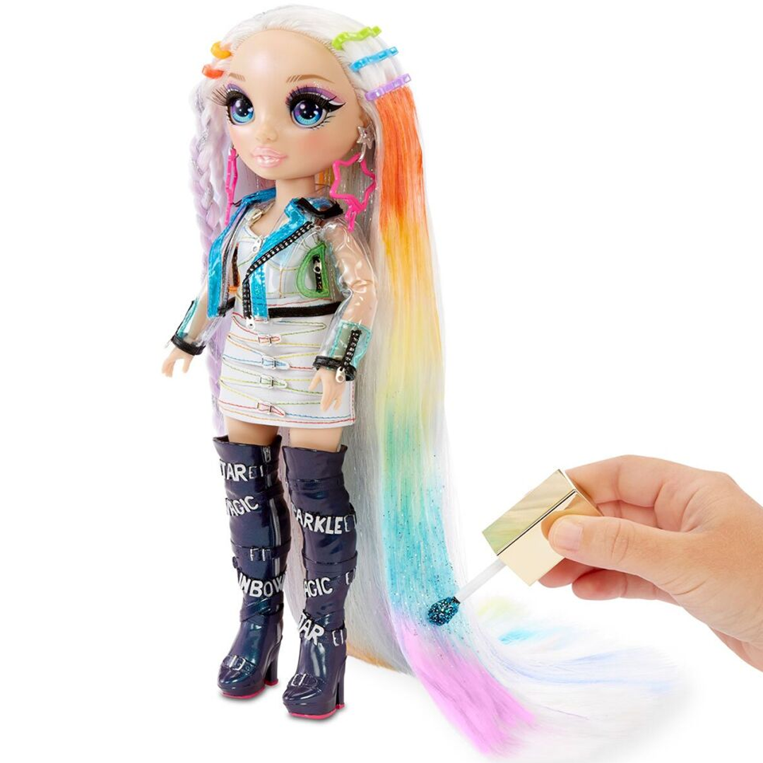 Неймовірно мила лялечка Rainbow High з розкішним волоссям і модним вбранням вже чекає на тебе. Створи імідж як у салоні: спробуй різні зачіски, стилі та кольори! Втілюй найсміливіші фантазії та неповторні образи – фарбуй волосся у яскраві кольори. Ти можеш додати блискучий гель, щоб образ був максимально сяючим. Використовуй крем для укладання. Прикрашай ним своє або лялькове волосся. Крем безпечний для дитини та легко змивається водою. До набору входить лялька, одяг, пара взуття, пара сережок, підставка, аплікатор для фарбування волосся, гребінець, крем 4-х кольорів, блискучий гель, 5 шпильок.
