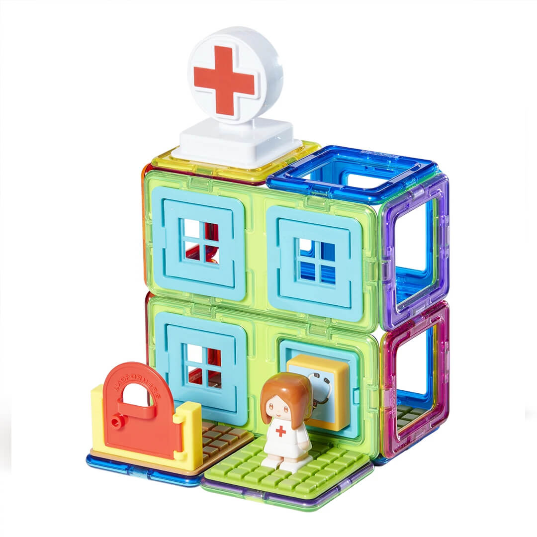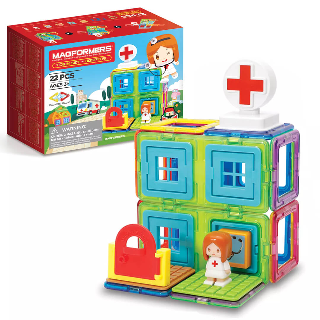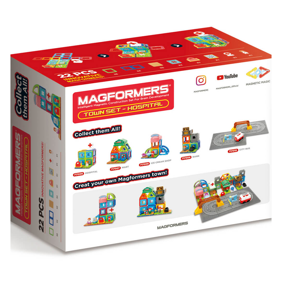 Тематичний набір з 22 елементів, що найкраще підійде для знайомства з сімейством магнітних конструкторів Magformers. Складається з 14 геометричних фігур, 7 аксесуарів у стилі лікарні та фігурки медсестри. Всередині кожної деталі є рухомі магніти, завдяки яким вони з'єднуються у конструкцію. Конструктор виготовлений з яскравих, якісних та безпечних матеріалів. Всі деталі в наборі сумісні з деталями з інших наборів "Магформерс". У комплекті є покрокова інструкція по складанню будівлі лікарні. Конструктор з магнітами розвиває у дитини просторове та логічне мислення, дрібну моторику, фантазію, сприйняття кольору та форм. Рекомендовано малюкам старше 3-х років.