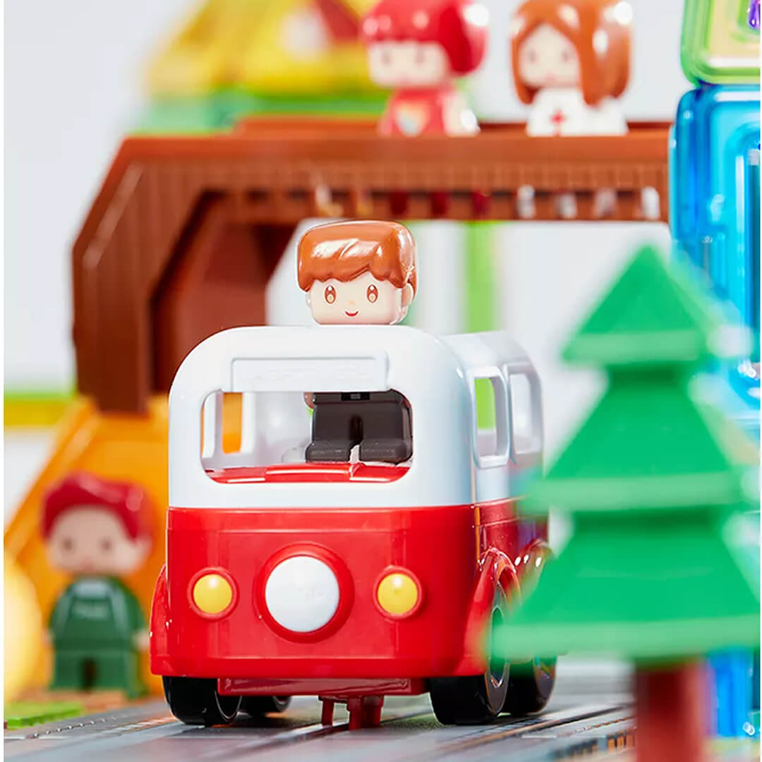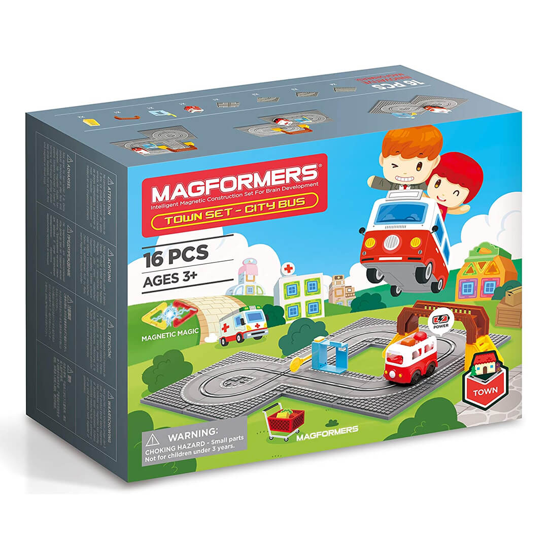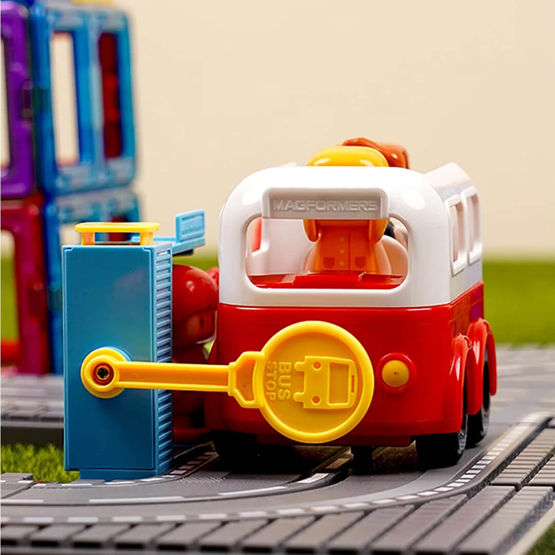 Тематичний набір серії "Місто", що найкраще підійде для знайомства з сімейством магнітних конструкторів Magformers. Складається з 16 елементів, з яких можна побудувати симпатичний автобус, дорогу з переїздом, шлагбаумом, та фігурки водія. Всередині кожної деталі є рухомі магніти, завдяки яким вони з'єднуються у конструкцію. Конструктор виготовлений з яскравих, якісних та безпечних матеріалів. Всі деталі в наборі сумісні з деталями з інших наборів "Магформерс". У комплекті є покрокова інструкція по складанню транспорту та треку. Конструктор з магнітами розвиває у дитини просторове та логічне мислення, дрібну моторику, фантазію, сприйняття кольору та форм. Рекомендовано малюкам старше 3-х років.
