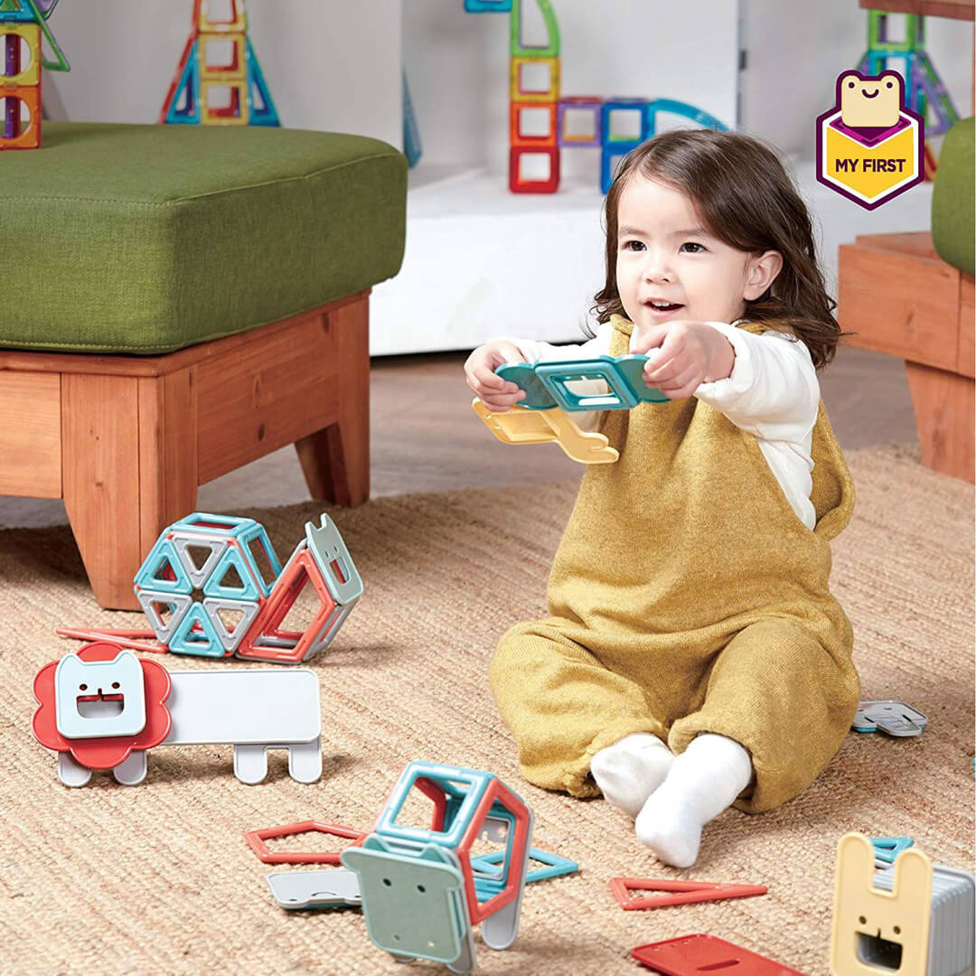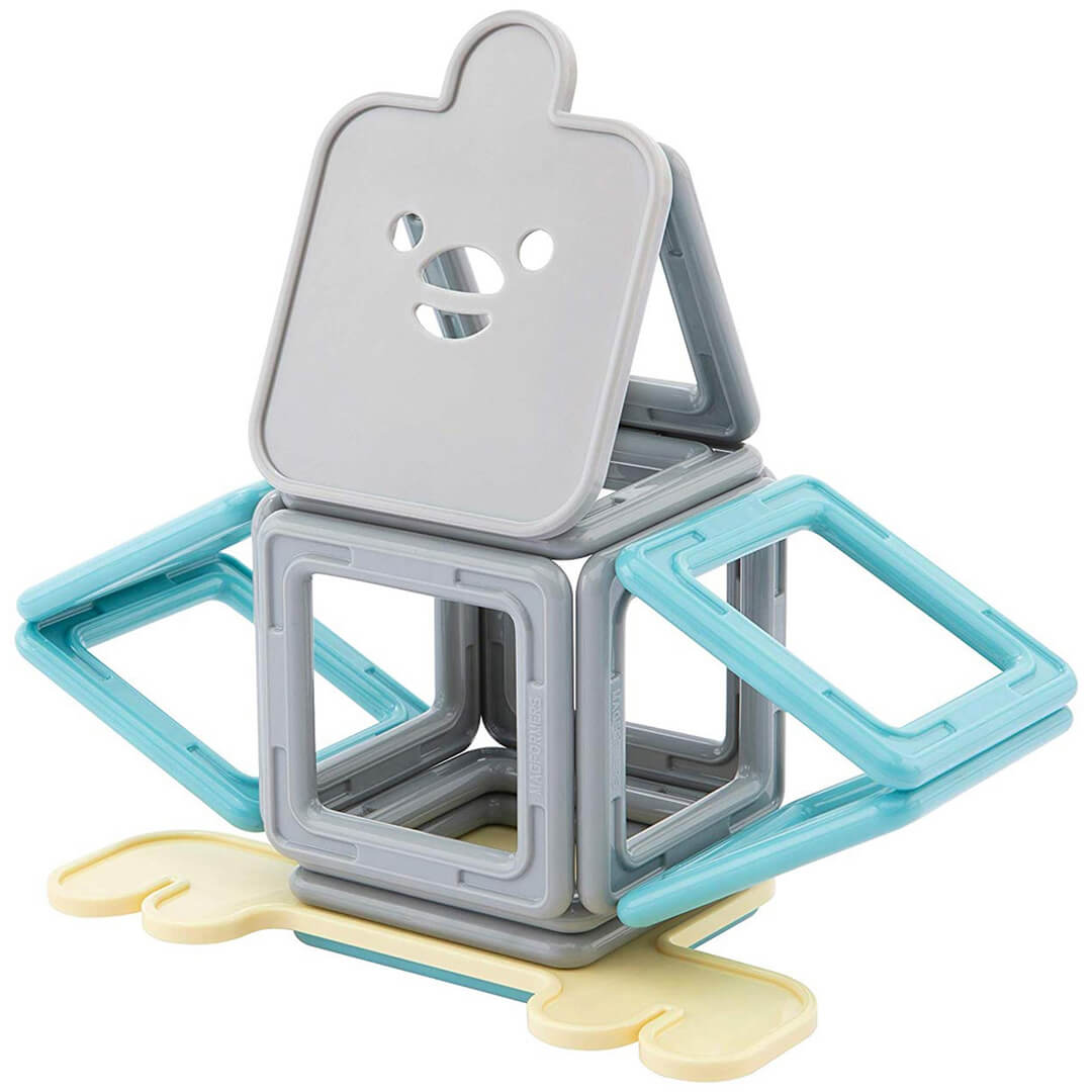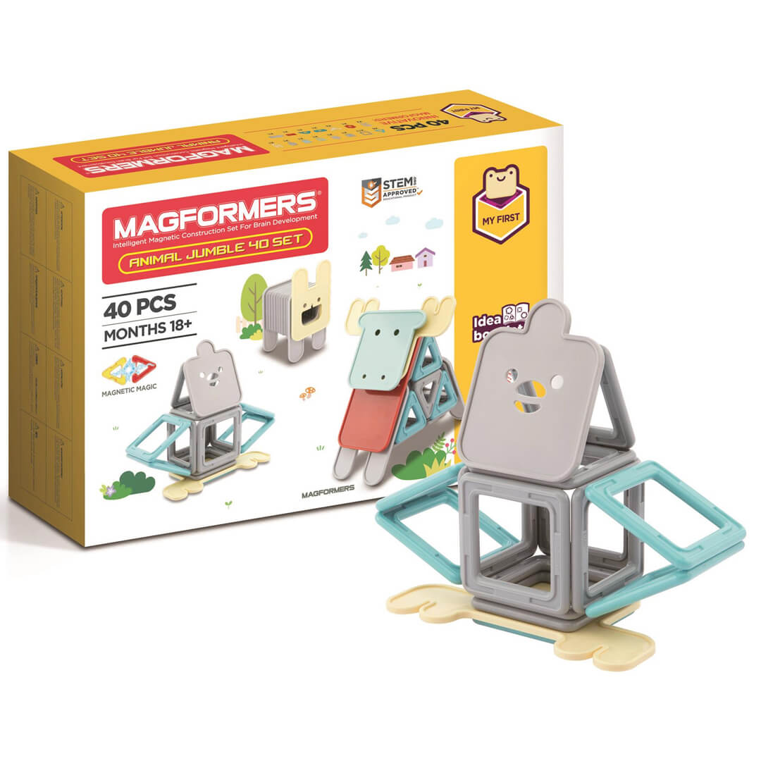 Магнітний конструктор Magformers для найменших малюків. Набір призначений дітям старше 18 місяців, складається з 40 елементів: 8 трикутників, 17 квадратів та 15 аксесуарів на кліпсах. Всередині кожної деталі є рухомі магніти, завдяки яким вони з'єднуються у конструкцію. Конструктор виготовлений з яскравих, якісних та безпечних матеріалів. Всі деталі в наборі сумісні з деталями з інших наборів "Магформерс". У комплекті є покрокова інструкція з прикладами складання фігурок різних тварин: мавпочки, коровки, слоненяти, кошеняти, собачки, жабки, зайчика, коали, оленя, левеняти, пташки. Конструктор з магнітами розвиває у дитини просторове та логічне мислення, дрібну моторику, фантазію, сприйняття кольору та форм.