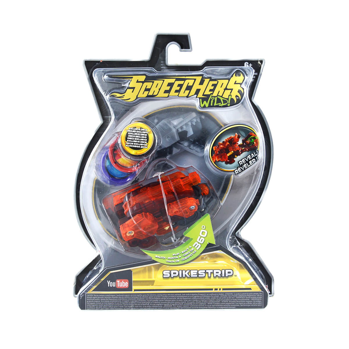Скрічер Спайкстріп трансформується в крутого стегозавтра. Для того, щоб трансформувати тварину назад, потрібно витягти диск і закріпити пружинку знизу машини і ви знову можете вступати в бій. Диск має гладку поверхню для бездоганного ковзання і гумову поверхню для фіксації на місці.