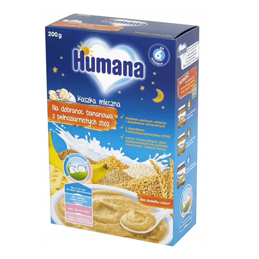 Каша Humana молочна Солодкі сни цільнозернова із бананом рекомендується як ситна та смачна злакова страва для малюків старше ніж 6 місяців. Забезпечує тривале насичення й додає енергії для ігор, якщо давати її маляті вранці, і гарантує міцний сон, якщо пропонувати її як вечірню страву. Молочний компонент каші поданий адаптованою молочною дитячою сумішшю, тому каша Humana молочна Солодкі сни з бананом легко засвоюється й добре переноситься малюками. Збагачена важливими для росту й розвитку малюка вітамінами, мікроелементами та мінералами, зокрема йодом, залізом, кальцієм і вітаміном Д. Містить натуральні пребіотики фруктоолігосахариди, які сприяють росту корисної кишкової мікрофлори та запобігають виникненню закрепів.