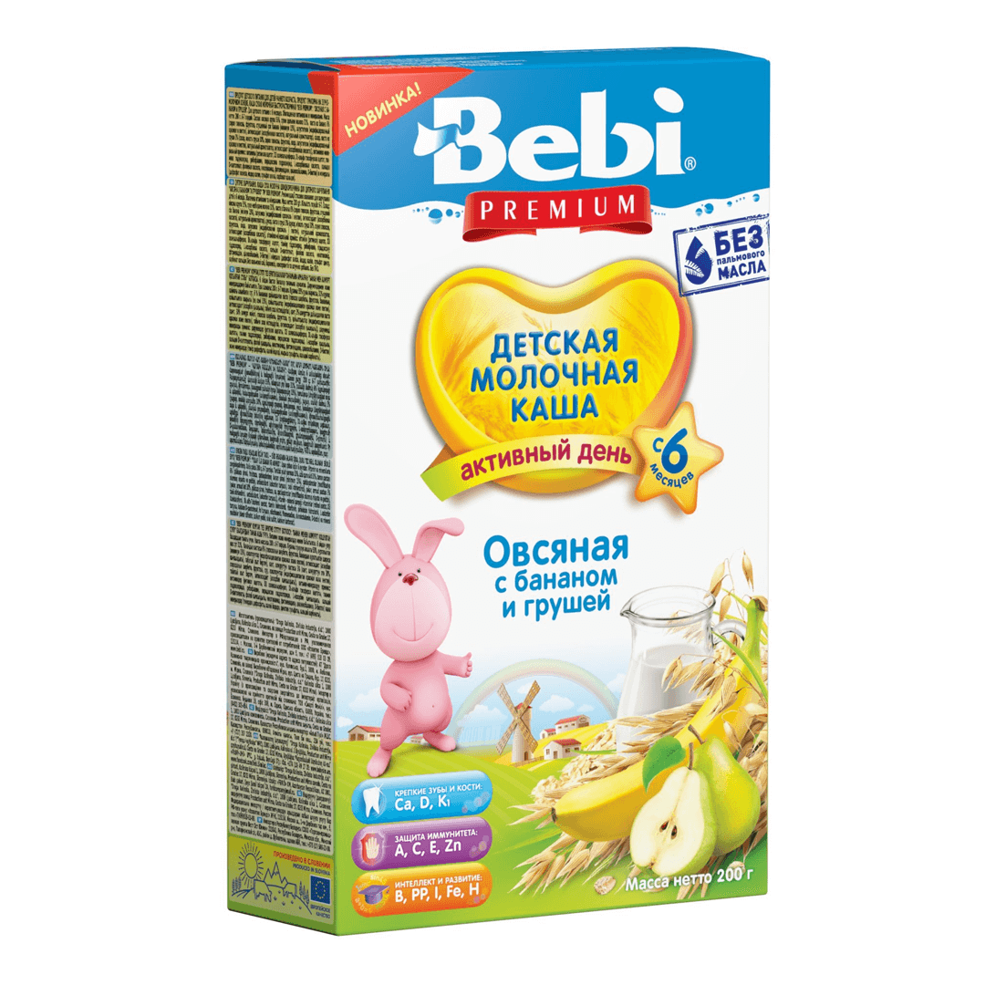 Склад: вівсяна крупа 55%, сухе незбиране молоко 31%, паста з банана 6% (сироп глюкози, фруктоза, згущений сік банана (мінімум 15%), загусники (модифікований крохмаль і пектин), антиоксидант (аскорбінова кислота), натуральний ароматизатор), цукор, паста з груші 3% (цукор, м'якоть груші 30%, сироп глюкози, фруктоза, вода, загусники (модифікований крохмаль і пектин), натуральний ароматизатор), антиоксидант (аскорбінова кислота)), вітамінно-мінеральний премікс: вітаміни (ретинолу ацетат, D3 холекальциферол, DL-альфа токоферолу ацетат, тіаміну гідрохлорид, рибофлавін, піридоксину гідрохлорид, L-аскорбінова кислота, кальцію D-пантотенат, фолієва кислота, нікотинамід, фітоменадіон, ціанокобаламін, D-біотин) та мінерали (дифосфат заліза, йодид калію, сульфат цинку, карбонат кальцію)