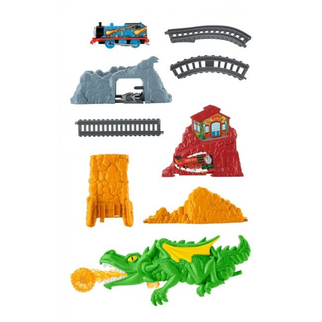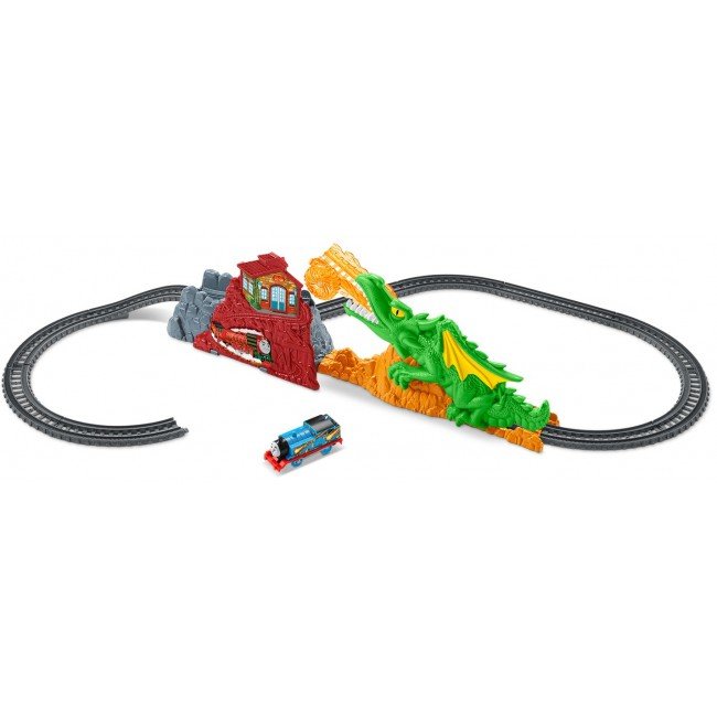З моторизованим ігровим набором "Втеча від дракона" юні фанати мультсеріалу "Томас і Друзі" зможуть перенестись у світ улюблених героїв та неймовірних пригод. Цього разу паровозик Томас подорожує до Китаю, де планує зустріти свого друга Йонг Бао. Але спочатку йому потрібно пройти випробування: за пагорбом сховався небезпечний дракон. Щоб потрапити на станцію, Томасу необхідно проїхати по спині монстра. Не витримуючи ваги паровозика, дракон падає та руйнує будиночок станції, стіна якого перетворюється на частину рейсів. Діти будуть із захватом запускати паровозик знов і знов, кидаючи виклики страшному дракону. Трек поєднується з усіма паровозиками та ігровими наборами серії TrackMaster. До набору входить моторизований паровозик Томас.