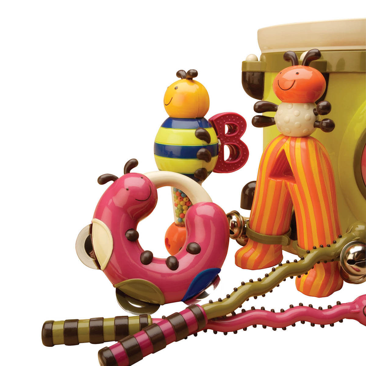 Барвистий набір музичних інструментів, виконаних в етнічному стилі, дозволить створити цілий оркестр! У комплекті: великий барвистий барабан, дві барабанні палички-змійки, два зручних маракаса, в тому числі бджілка-маракас з тріскачкою, симпатичний тамбурин, виконаний у вигляді гусениці, мураха з бубонцями. Музична іграшка "Парам-пам-пам" допоможе в розвитку музичного слуху, креативності, уяви. Розвиваючі іграшки Battat: будь музичним, будь веселим, будь собою! Розмір іграшки - 30 х 28 х 23 см. Рекомендований вік - 18 місяців до 3 років.