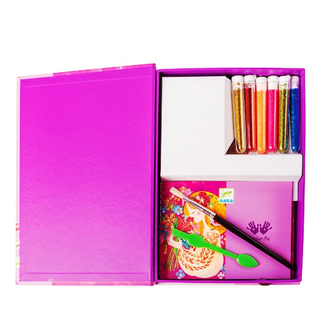 Набір "Аромат квітів" для малювання складається з 4 картин, 6 тюбиків з блискітками, пензлика, стека. Призначений дітям від 7 до 13 років. Виробник - французька компанія DJECO. До комплекту входить покрокова інструкція, дотримуючись якої можна зробити блискучу картину. На розмальовці зображені феї квітів. Деталі картини мають клейову поверхню. Покладіть картинку в коробку та зніміть з неї тонкий верхній шар. За допомогою пензлика нанесіть блискітки на малюнок. Використовуючи стек, приберіть зайві блискітки. Набір допоможе освоїти техніку малювання блискітками, проявити творчу фантазію. Дитина вчиться бути посидючою, акуратною, старанною.