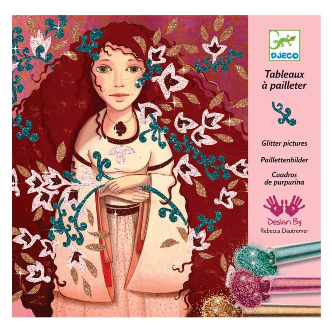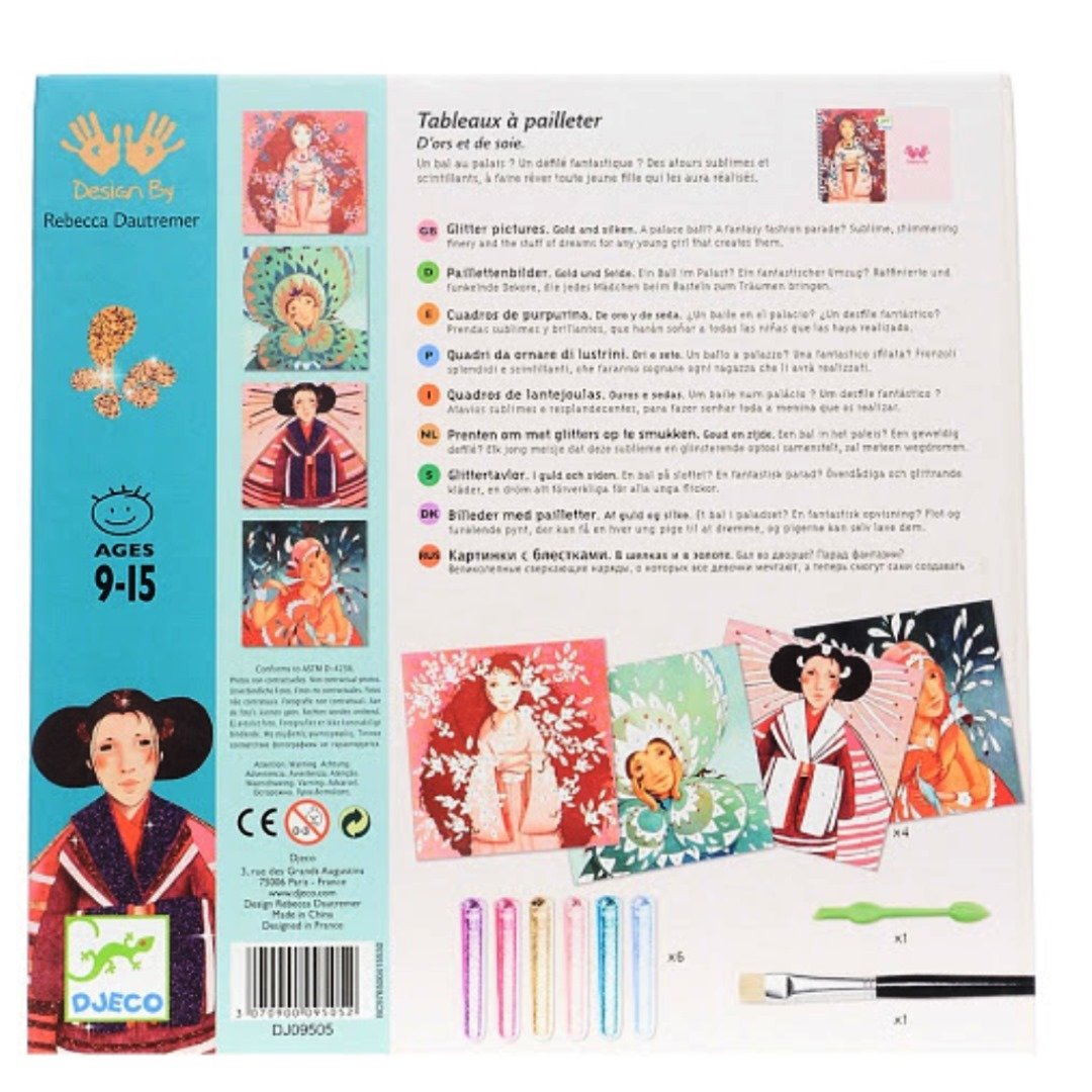 Набір "Золото та шовк" для малювання складається з 4 картин-шаблонів, 6 тюбиків з блискітками, пензлика, стека. Призначений дітям від 9 до 15 років. Виробник - французька компанія DJECO. До комплекту входить покрокова інструкція, дотримуючись якої можна зробити блискучу картину. Зображення розмальовок виконані у східній тематиці. Деталі картини мають клейову поверхню. Покладіть картинку в коробку та зніміть з неї тонкий верхній шар. За допомогою пензлика нанесіть блискітки на малюнок. Використовуючи стек, приберіть зайві блискітки. Набір допоможе освоїти техніку малювання блискітками, проявити творчу фантазію. Дитина вчиться бути посидючою, акуратною, старанною.