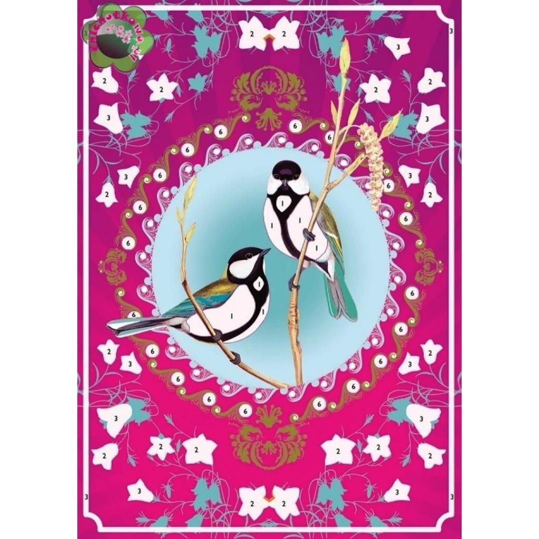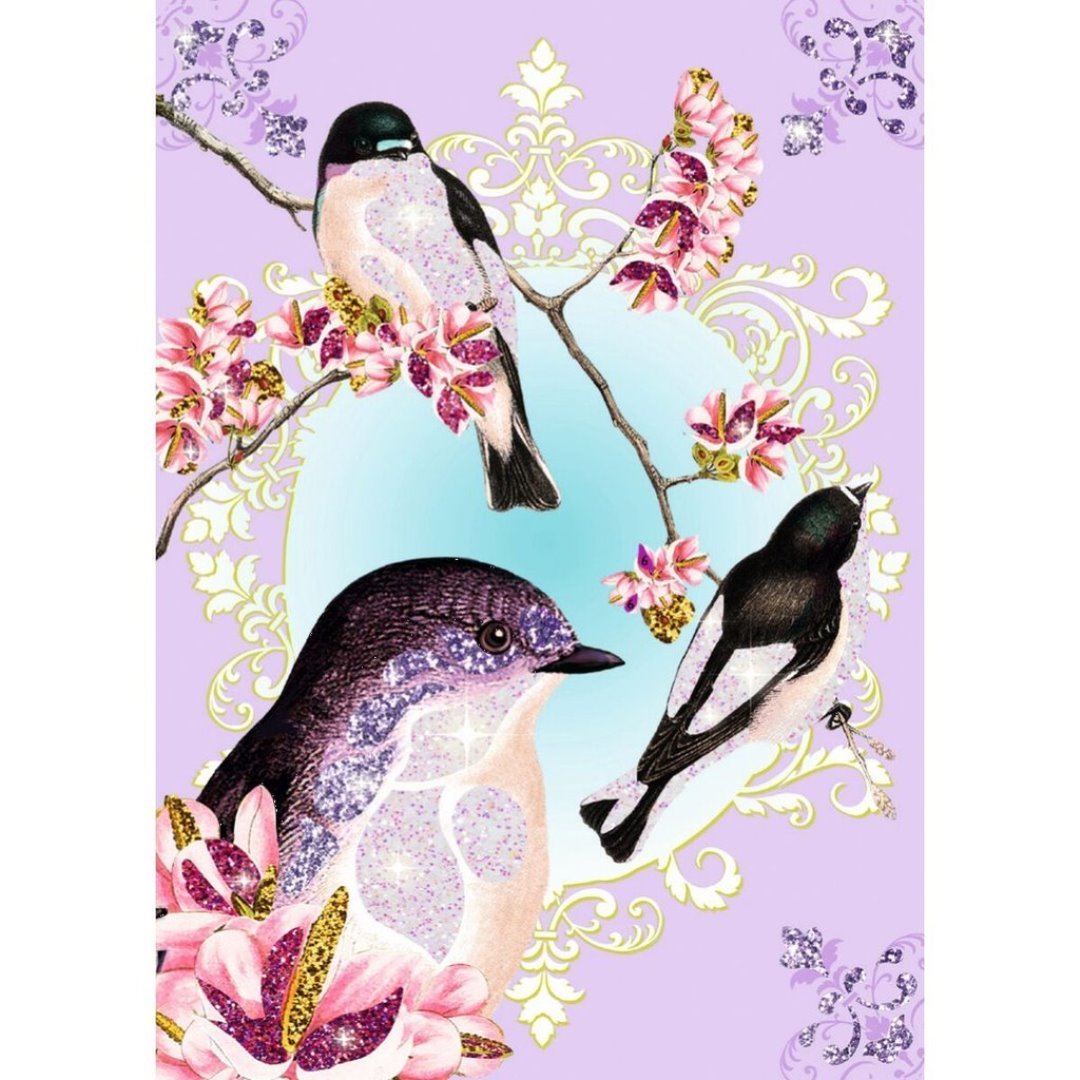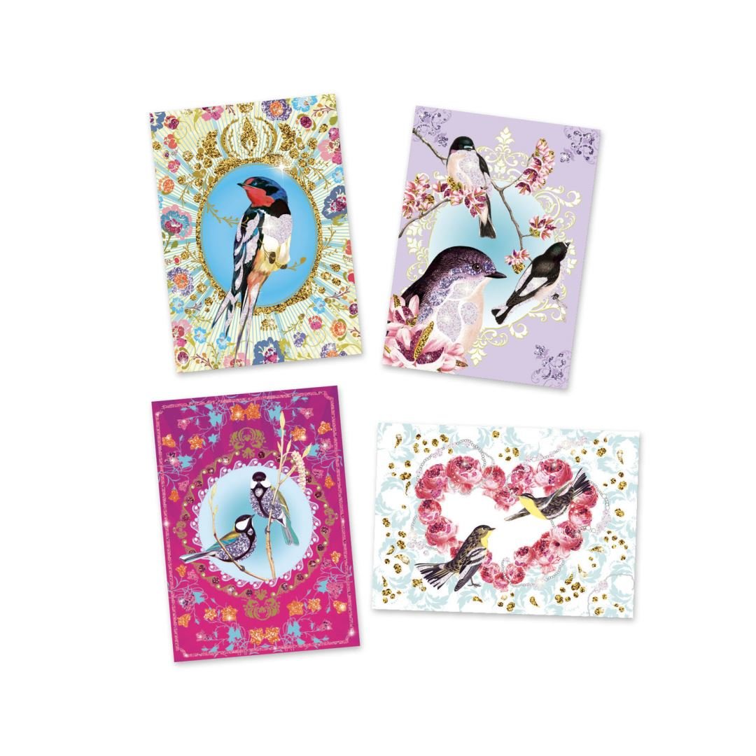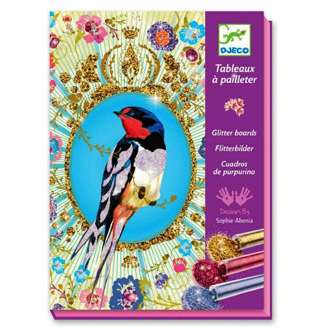 Набір "Птахи з блискітками" для малювання складається з 4 картин, 6 тюбиків з блискітками, пензлика, стека. Призначений дітям від 7 до 13 років. Виробник - французька компанія DJECO. До комплекту входить покрокова інструкція, дотримуючись якої можна зробити блискучу картину. На розмальовці зображені птахи. Деталі картини мають клейову поверхню. Покладіть картинку в коробку та зніміть з неї тонкий верхній шар. За допомогою пензлика нанесіть блискітки на малюнок. Використовуючи стек, приберіть зайві блискітки. Набір допоможе освоїти техніку малювання блискітками, проявити творчу фантазію. Дитина вчиться бути посидючою, акуратною, старанною.