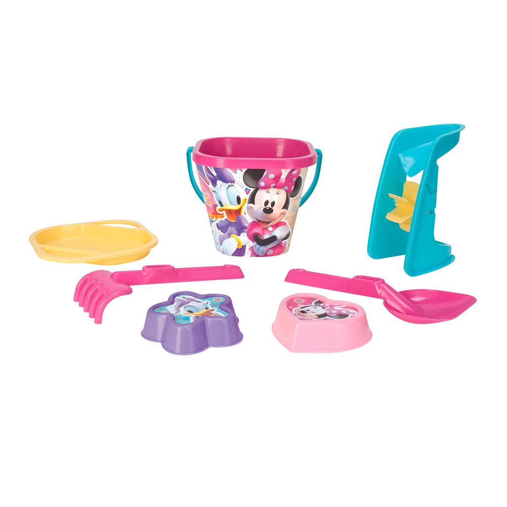 Набір для піску з улюбленими мультяшними персонажами - це подвійне задоволення. У комплекті: відро об'ємом 2 л, млин, лопатка, грабельки, сито і дві форми для ліплення з піску. На відро нанесений малюнок з Мінні і Міккі Мауса, які посміхаються і дарують радість оточуючим.