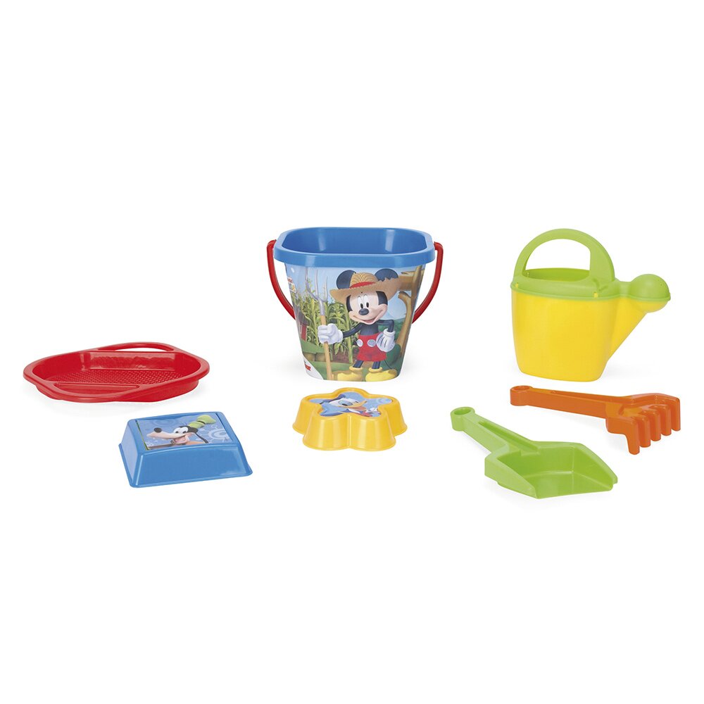 Ігровий набір для пісочниці від європейського виробника Wader складається з 7 елементів і включає: відро, кришку-ситечко, граблі, лопатку, 2 форми для ліплення фігур з піску у формі квадрату та п'ятикутної зірки, лійку для води. Зовні відерце прикрашене ліцензованим зображенням Disney за мотивами мультфільмів про "Мікки Мауса". Матеріал: пластик. Від 1 року.