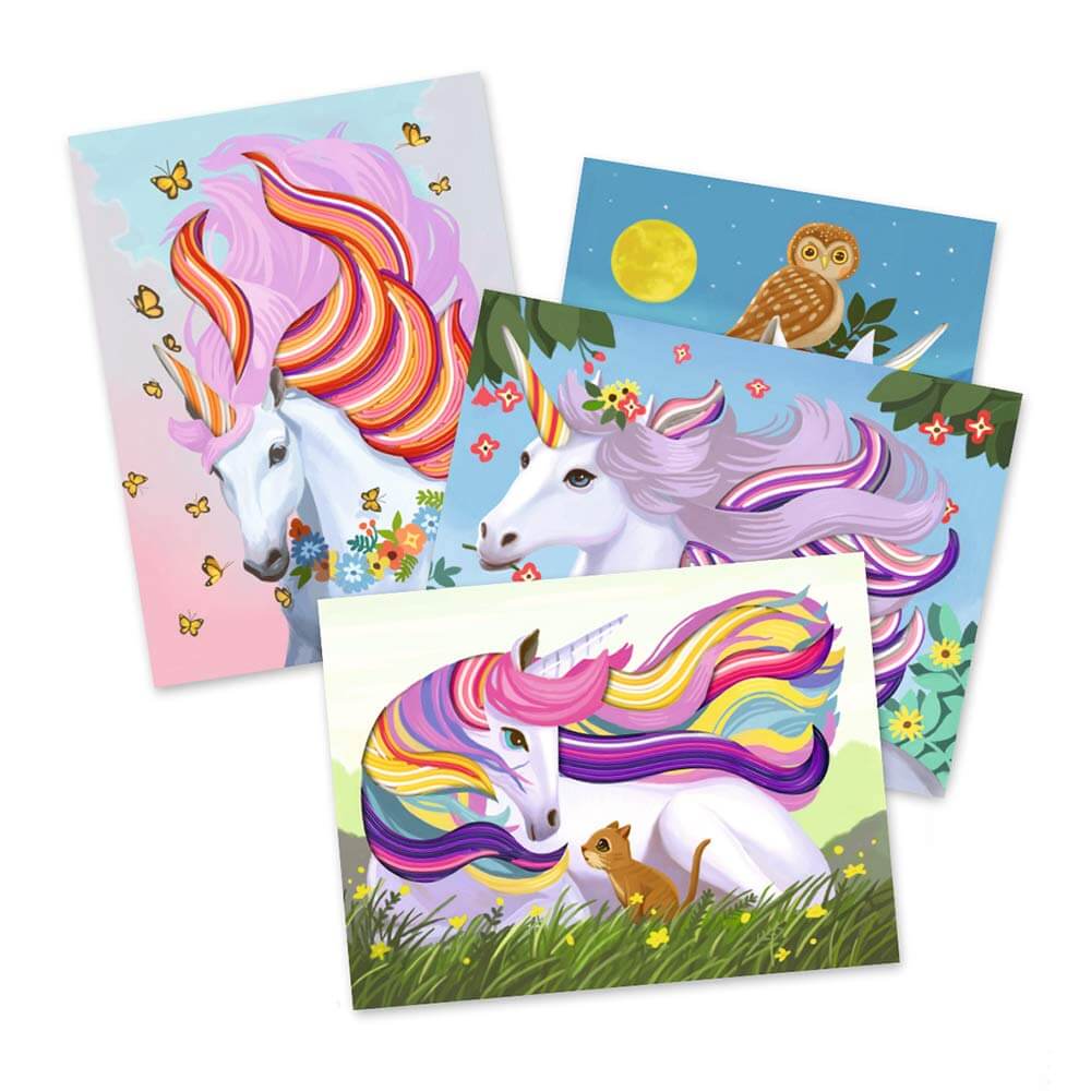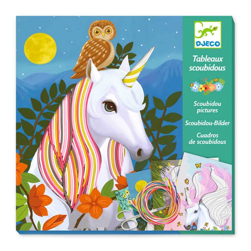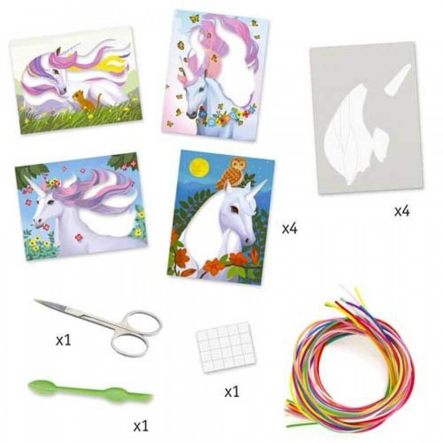 "Чарівні єдинороги" Djeco - творчий набір з тасьмою для дівчаток старше 7 років. До набору входять: 4 ілюстровані шаблони єдинорогів, комплект різнобарвної пластикової тасьми, двосторонні наклейки, детальна інструкція. Всі елементи набору виготовлені з сертифікованих і повністю безпечних матеріалів високої якості. Працюючи над картинами, дівчинка розвиватиме уважність та посидючість, креативність, художній смак.