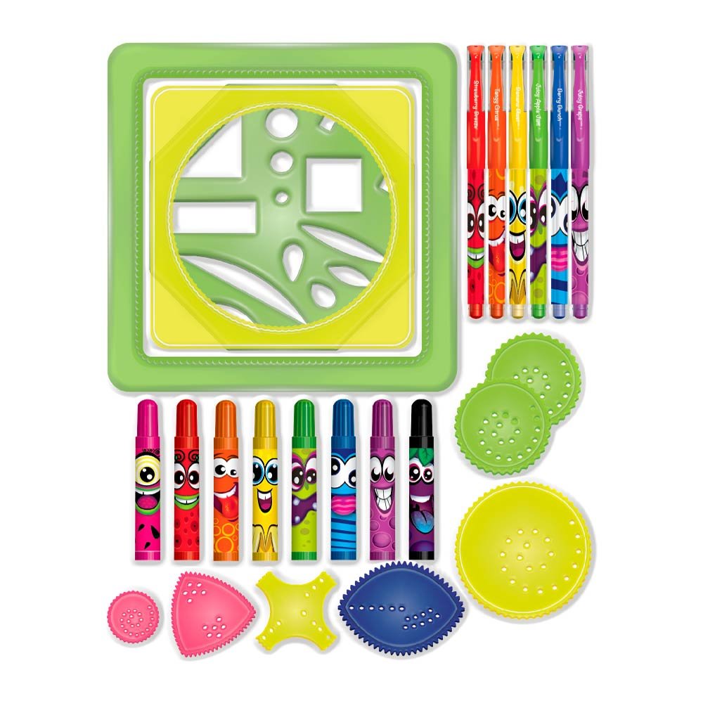 Створіть унікальний яскравий малюнок з набором Scentos "Бешкетні візерунки". До набору входять: 6 ароматизованих гелевих ручок, 10 аркушів паперу, 8 ароматизованих міні-маркерів, 2 пластини-лекала для візерунків, 7 кіл для створення візерунків. Малюйте неймовірні візерунки за допомогою спеціальних лекал та форм. А гелеві кольорові ручки та міні-маркери ароматизовані, тому малюнки будуть виходити не тільки красивими, а й будуть мати приємний запах. Рекомендовано для дітей від 3-х років.