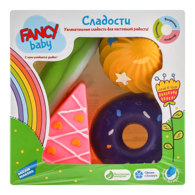 Корисний процес купання малюка повинен не тільки зміцнювати його імунну систему, а й стимулювати правильний психоемоційний розвиток. У цьому на допомогу батькам прийде набір іграшок для купання "Солодощі" від Fancy Baby. Набір яскравих і кумедних іграшок перетворить просте купання в захоплюючу гру. У набір входить тортик, кексик, пончик і еклер. Набір зроблений з якісних нетоксичних полімерних матеріалів, які відмінно переносять перепади температури, не виділяючи при цьому токсичних речовин.