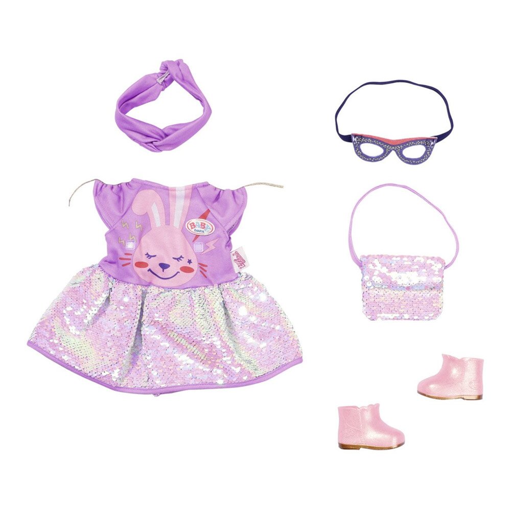 Пупсик вашої дитини потребує поповнення гардеробу? Вихід є — набір одягу для ляльки Baby Born День народження Делюкс. Одяг сподобається дітям віком від 3-х років. Набір створить повноцінний святковий образ для пупсика, висотою 43 см. Сукню легко одягнути на ляльку і легко зняти. Зверніть увагу на дизайн — милий зайчик прикрашає топ сукні, а спідниця оздоблена паєтками, як і сумочка. Ці деталі додають одягу чарівності. У комплекті: фіолетова сукня із зайчиком; фіолетова пов’язка на голову; окуляри з блискітками; рожева сумочка з паєтками; рожеві чобітки.