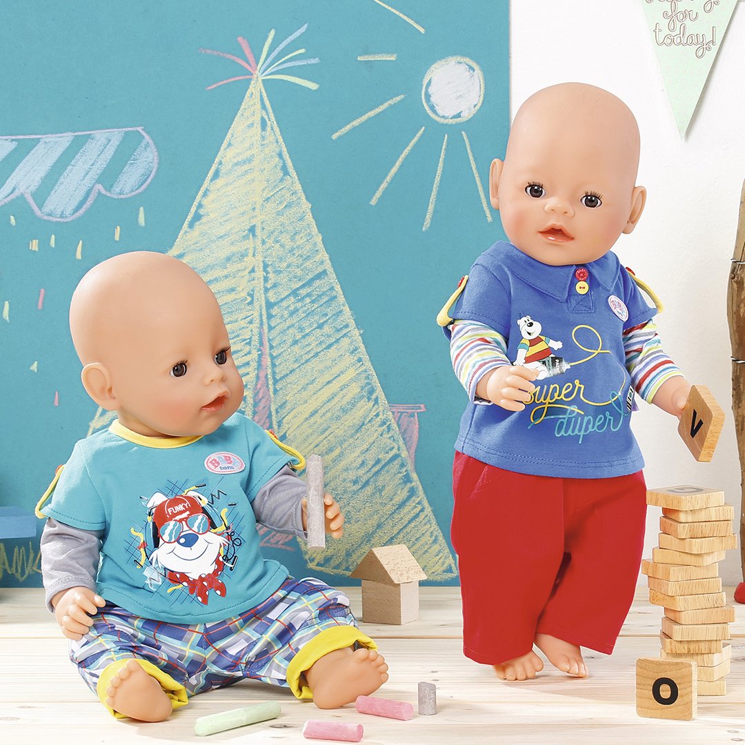 Поповніть гардероб малюка“Бебі Борн”! У комплект входять дві речі - кофта та штани. Набір рекомендовано дітям старше 3-х років. Вбрання підходить лялькам-немовлятам Baby Born заввишки 43 см. Вашому пупсу час збиратися на прогулянку. Який комплект оберете? В асортименті два варіанти. Блакитний лонгслів з жовтим кантом доповнюють клітчасті штанці. З синьою кофтою йдуть червоні повзунки. Обидва комплекти яскраві та модні. Виготовлені в стилі кежуал, з якісного трикотажу. Кофти прикрашають принти з ведмедем. Вбрання легко одягати та знімати. Його можна прати як звичайний одяг. Гра з ляльками Baby Born розвиває фантазію, увагу, логічне мислення, емоційне сприйняття, комунікативні якості, чуйність. Вчить піклуватися. Артикул 791340.