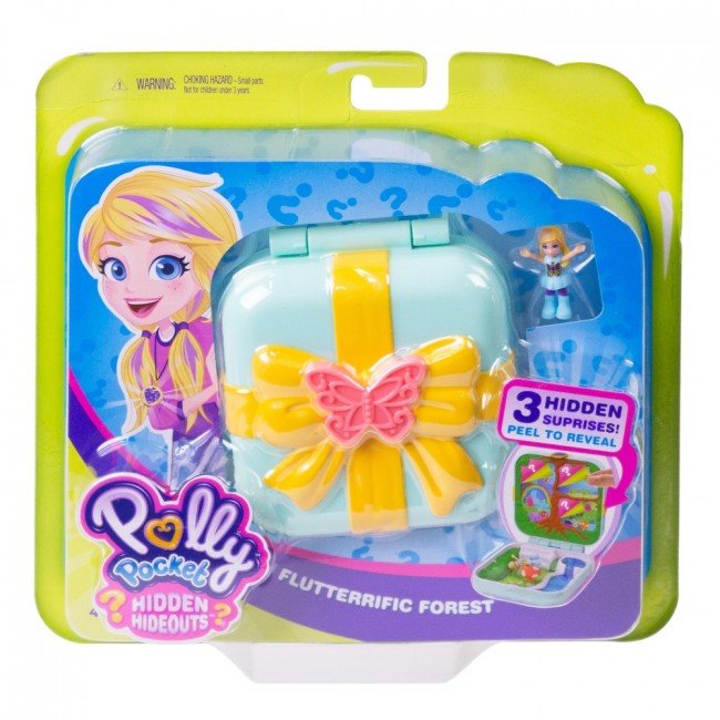 На перший вигляд це невеличка подарункова коробочка з бантом. Але якщо її відкрити, з'являється чарівний світ Polly Pocket з різними сюрпризами. На верхній частині коробки ви знайдете яскравий знімний паперовий фон. А під папером - 3 секретні містечка і 3 аксесуари.