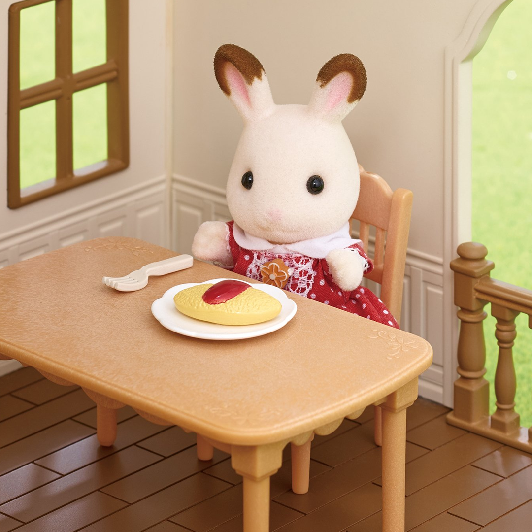 Двоповерховий іграшковий будиночок створений Sylvanian Families для захопливих сюжетно-рольових ігор малюків старше 3-х років. У наборі є меблі та фігурка кролиці Марії. На нижньому поверсі будиночку розташована їдальня зі столиком, стільцями, кухонним гарнітуром, плитою, мийкою. На верх ведуть сходи. Там знаходиться затишна спальня з ліжком. Для цікавішої гри в наборі є мініатюрний посуд, їжа, постіль. Будиночок з меблями зроблено з якісного, міцного, безпечного пластику. Гра тренує дрібну моторику та координацію рухів, формує образне мислення та просторове сприйняття, розвиває уяву й творчі здібності.