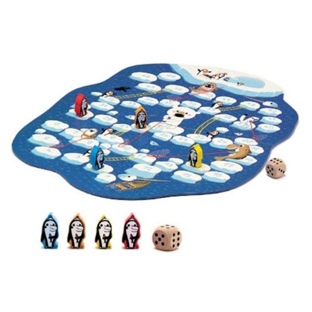 Гра призначена для хлопчиків і дівчаток від 5 років. У грі бере участь від 2 до 4 осіб. На ігровому полі зображені "крижинки", за якими пінгвінчики пересуваються до себе додому, на айсберг. Комплектація: розкладне ігрове поле, 4 різнокольорові фігурки пінгвінів, кубик для визначення кількості ходів, ілюстрована книжка з правилами гри. Ігровий набір упакований в барвисту унікальну упаковку з щільного картону. Всі елементи виконані з високоякісних екологічних матеріалів.