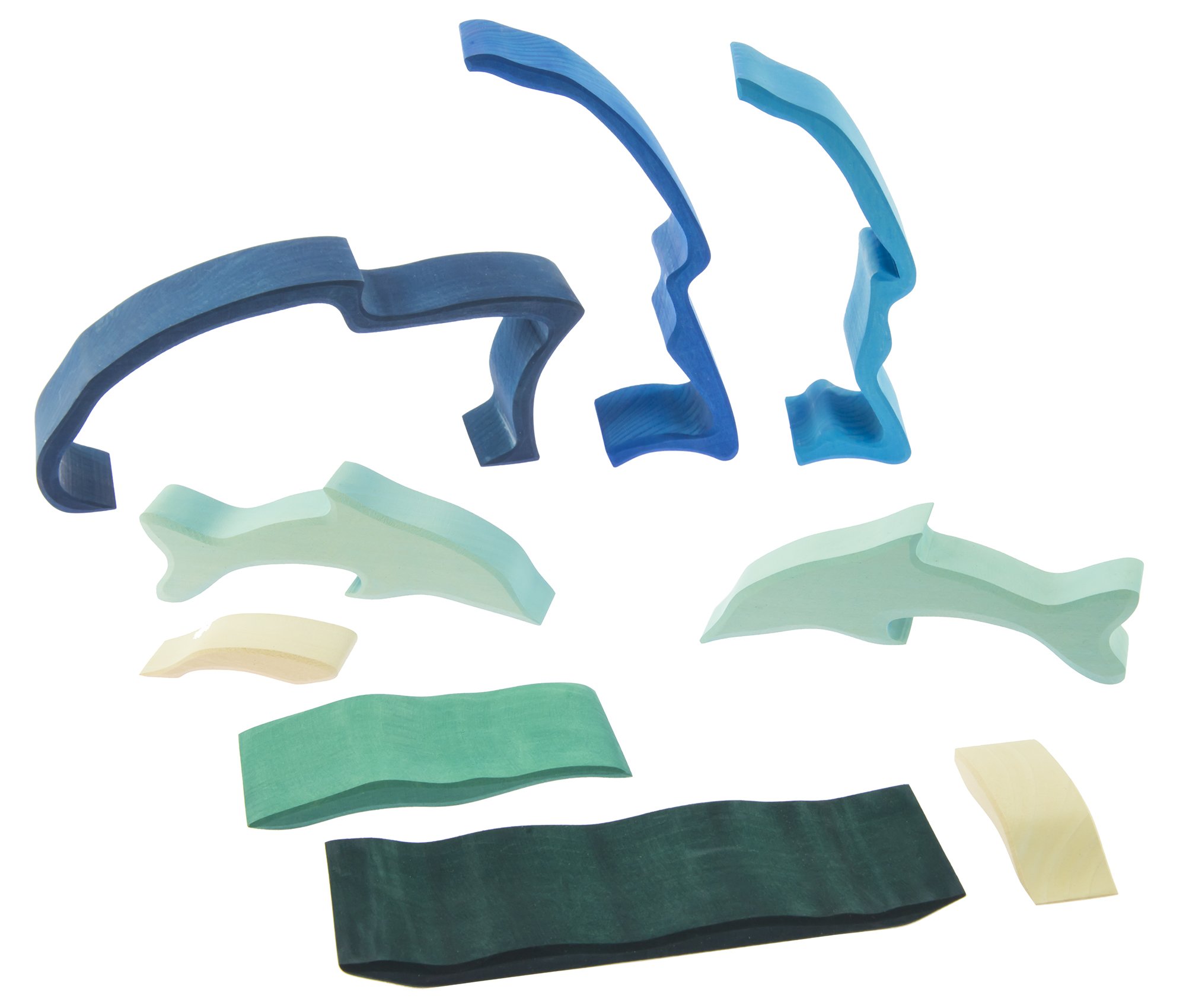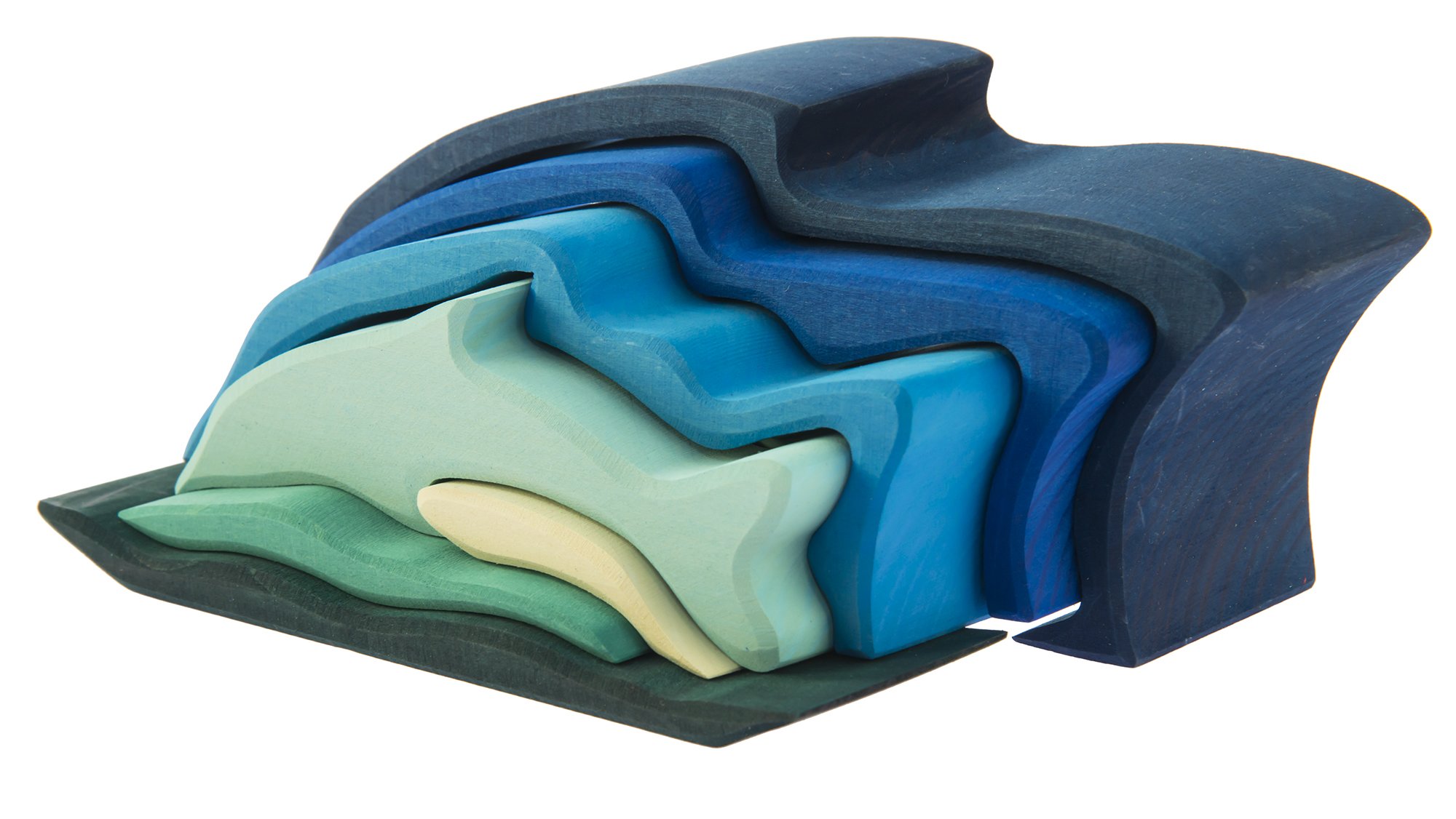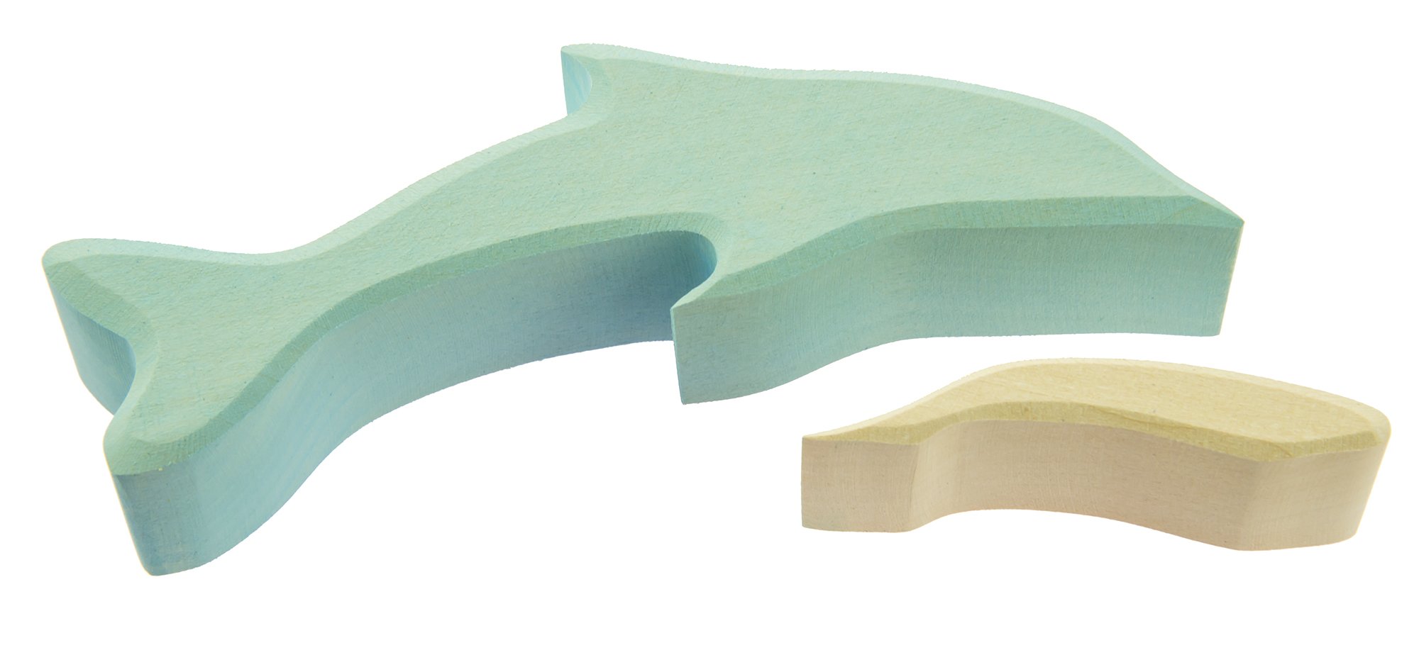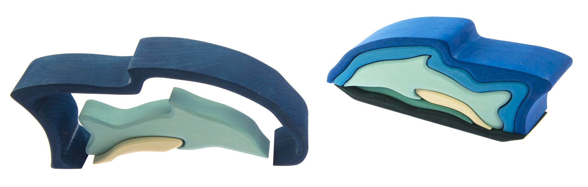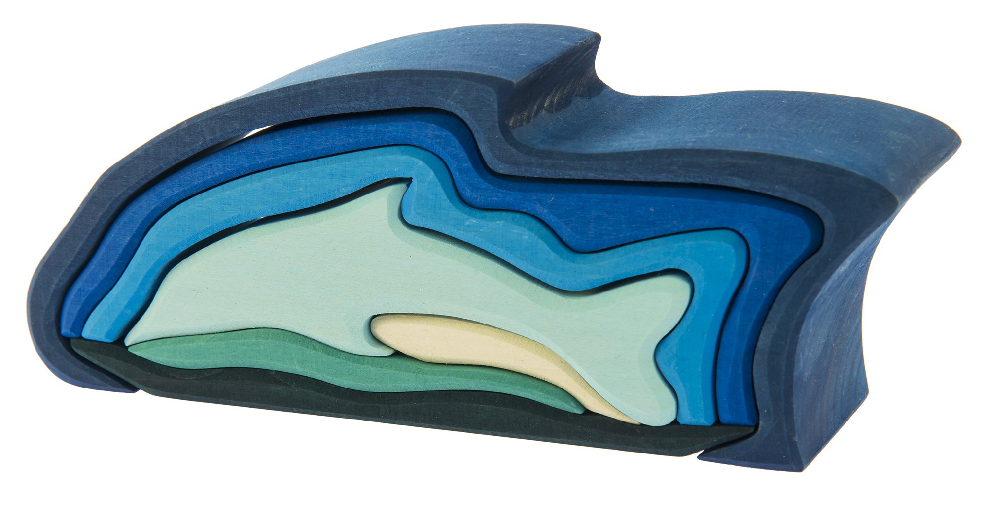 Дітлахи будуть у захваті від конструктора у вигляді дельфіна, який пливе на морських хвилях. Набір німецького виробника іграшок nic - це пазл, який необхідно скласти в певному порядку за розміром деталей. Конструктор запакований у прозору поліетиленову плівку, під якою складено 9 деталей у насичених блакитно-смарагдових кольорах.