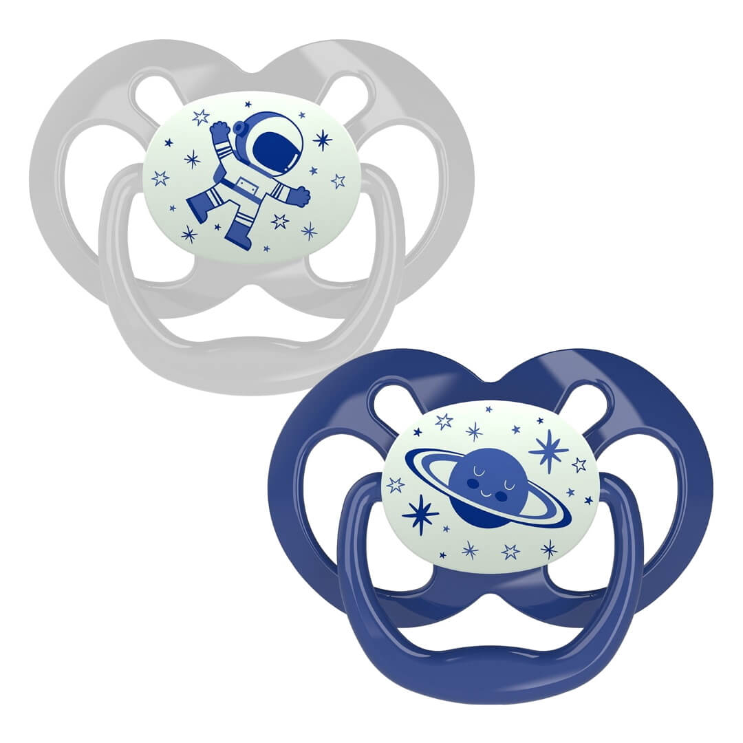У комплект входять 2 пустушки з силікону з підсвічуванням для дітей 6-12 місяців, 2 кришечки. У міру зростання дитини пустушки слід замінювати на відповідні за віком та розміром. При появі будь-яких дефектів пустушку необхідно замінити на нову. Для формування правильного прикладання до грудей намагайтеся не пропонувати пустушку перший час після народження.