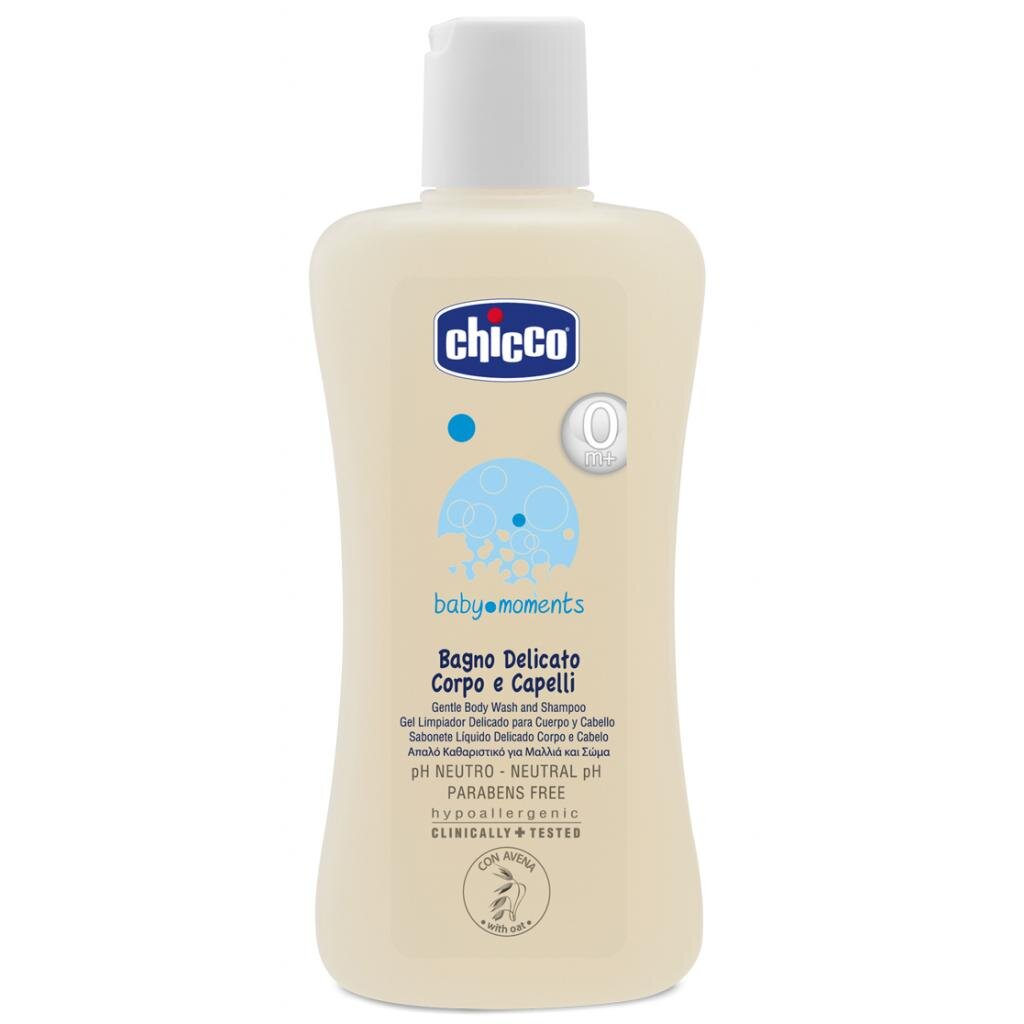 Шампунь для тіла і волосся Baby Moments Chicco представляє лінію косметики Baby Moments, в якому зібрано повний спектр засобів для щоденного догляду за ніжною і чутливою шкірою малюка з перших днів життя. Шампунь для тіла і волосся спеціально створений для делікатного очищення ніжної, чутливої і сухої шкіри новонароджених. Екстракт вівса надають пом'якшувальну і зволожуючу дію, що дозволяє очищати шкіру дбайливо. Формула "без сліз" не подразнює очі. Нейтральний рівень рН (7).