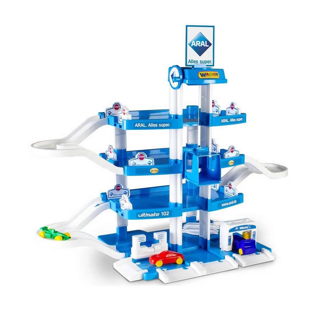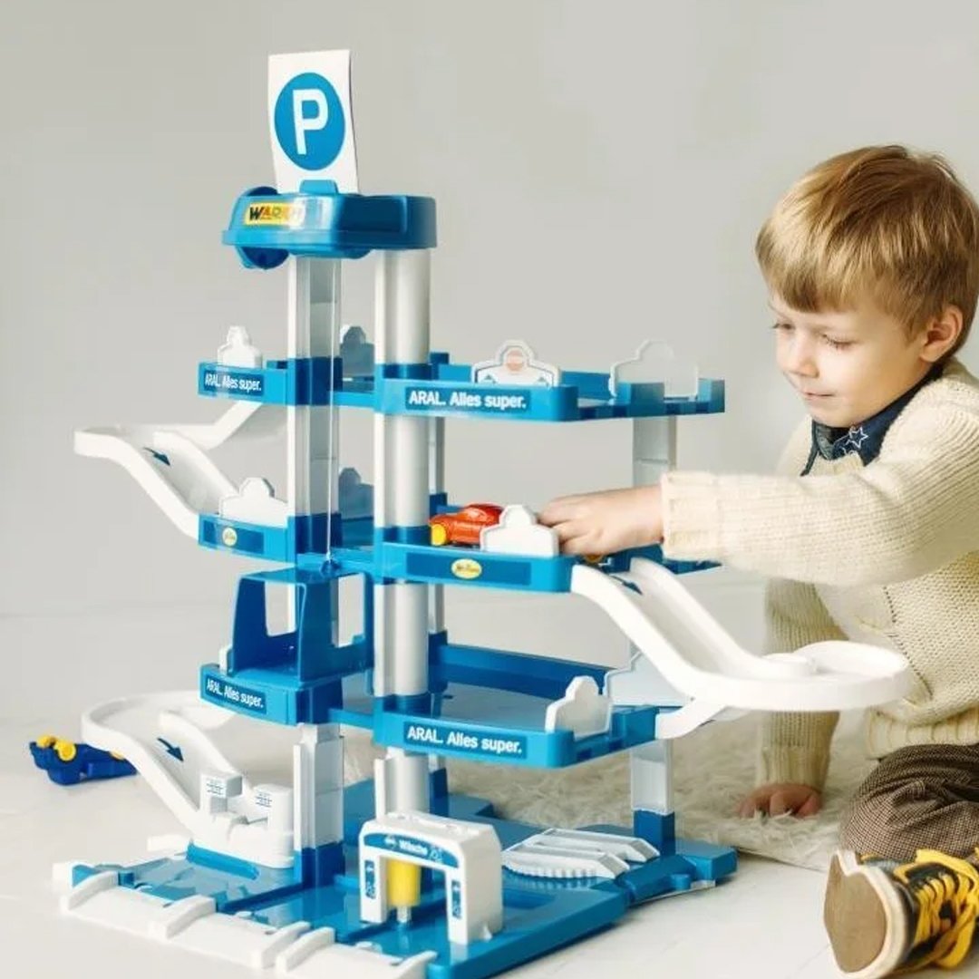 Іграшкова чотирьохрівнева стоянка для машин створена для дітей від 3-х років. Виготовлена з міцного нешкідливого пластику. Елементи конструктору легко та надійно поєднуються між собою. Їх можна комбінувати з деталями інших гаражів “Вейдер”. На першому поверсі паркінгу розташовані: естакада, мийка, заправка. Верхні рівні використовуються як майданчик для паркування авто. Між поверхами є похилі спуски. Підніматися з рівня на рівень можна і за допомогою ручного ліфта. До комплекту, крім конструктора, входять дві маленькі машинки та наліпки для декорування треку. У розкладеному вигляді паркінг можна зберігати у картонній коробці. Гра з конструктором розвиває логічне мислення, увагу та фантазію. Артикул 800530.