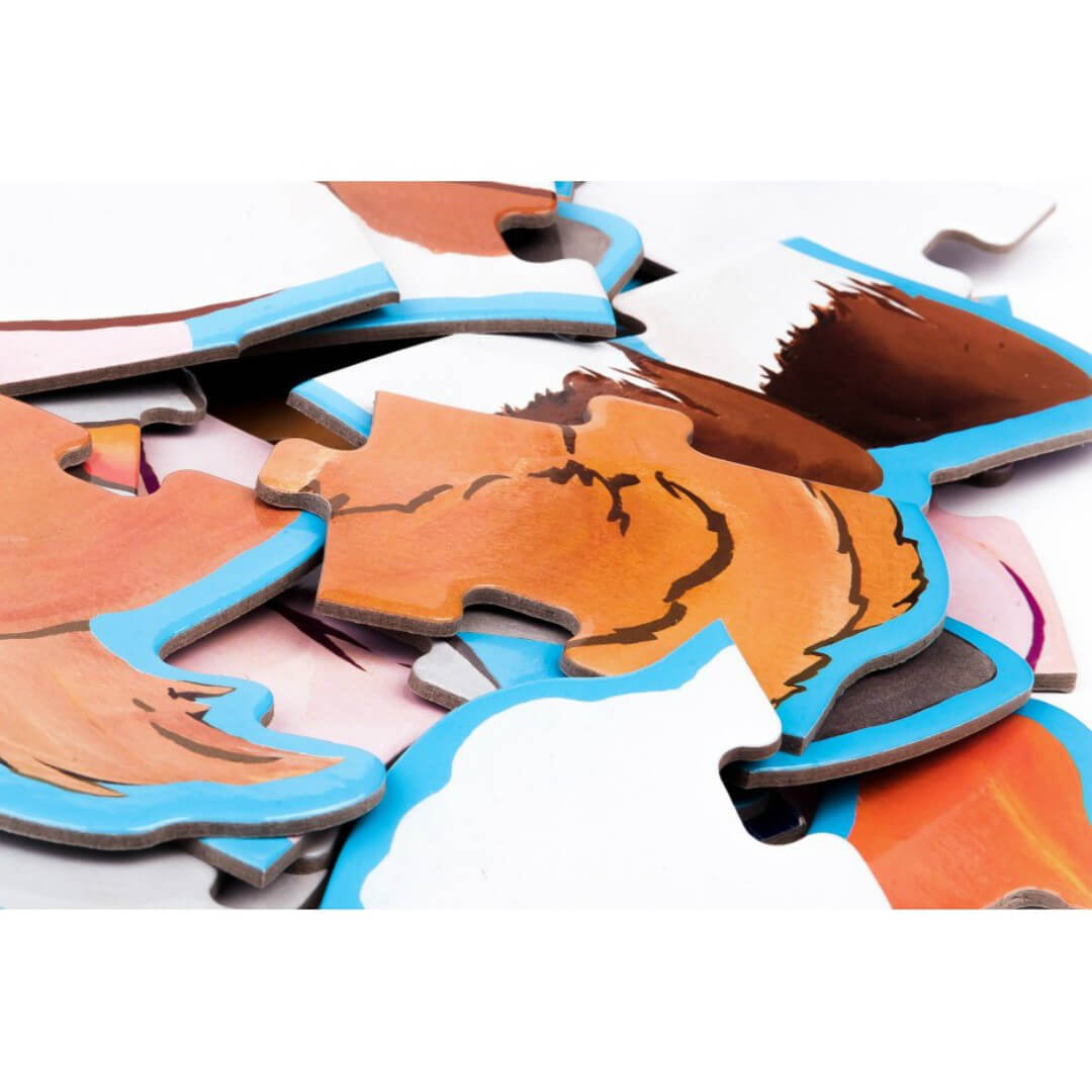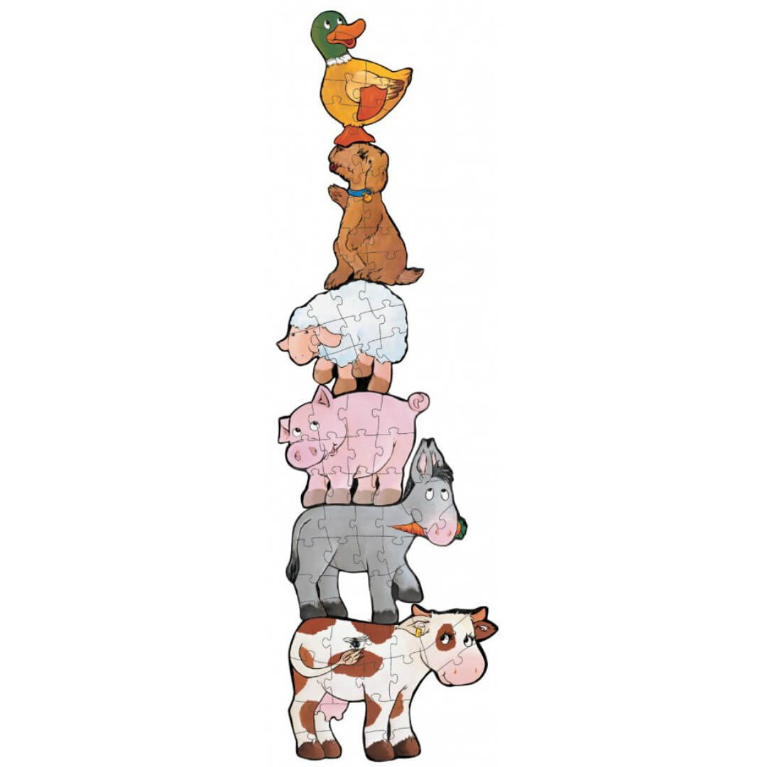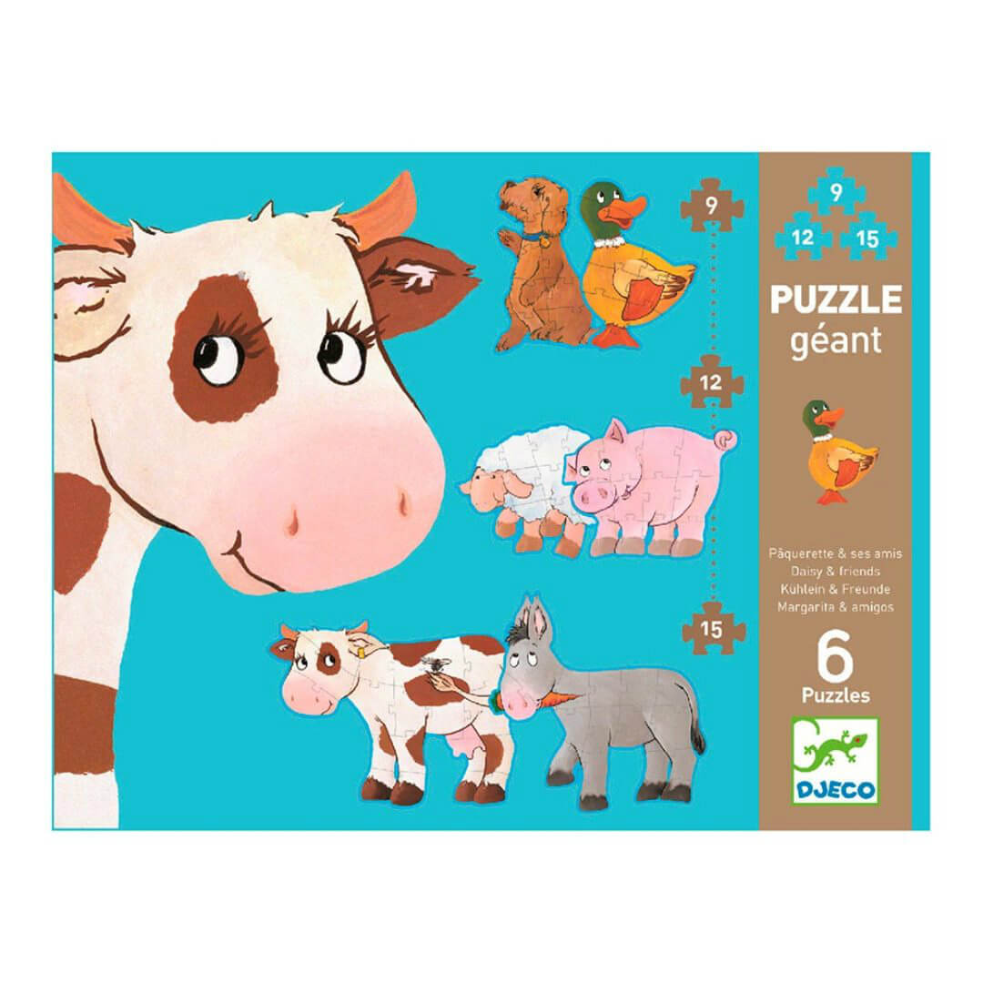 "Корова Маргарита і її друзі" - гігантський пазл для дітей від 3 років. Завдання маляти - зібрати всіх тварин. Картинки різної складності. Найбільші тварини - корова та віслюк - складаються з 15 елементів. Середні фігурки (поросятко та ягнятко) мають 12 складових. У картинок с собачкою та качечкою - 9 деталей. Із зібраних тваринок можна побудувати вежу. Складаючи пазли, дитина стає більш посидючою та уважною. Гра розвиває логічне мислення, орієнтацію у просторі, знайомить зі свійськими тваринами, величинами.