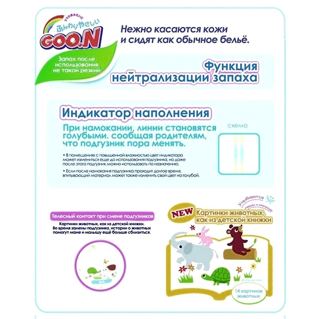 • Японські підгузки GOO.N створені, щоб малюк був здоровий, а його шкіра залишалася сухою та гладенькою! Мають м'яку сітчасту зовнішню поверхню, через яку всередину трусиків пропускається повітря, а назовні виводиться піт. Мембранна плівка забезпечує абсолютну повітропроникність гігієнічного засобу. Підгузки "Гун" дарують малюкам максимальну ніжність за рахунок внутрішнього шару, неймовірного по своїй м'якості. Рідина миттєво всмоктується в 3D-поверхню і замикається у суперабсорбенті. Хвиляста поверхня підгузника з вітаміном Е тільки злегка торкається попки, що попереджає появу подразнень і попрілостей. Є індикатор-нагадування про зміну підгузника. Передбачена нейтралізація неприємного запаху. Ще одна перевага дитячих трусиків - комфортна посадка без слідів на шкірі. З оновленої упаковки посміхаються малюки, які знають, що Goo.N - знак турботи і любові!