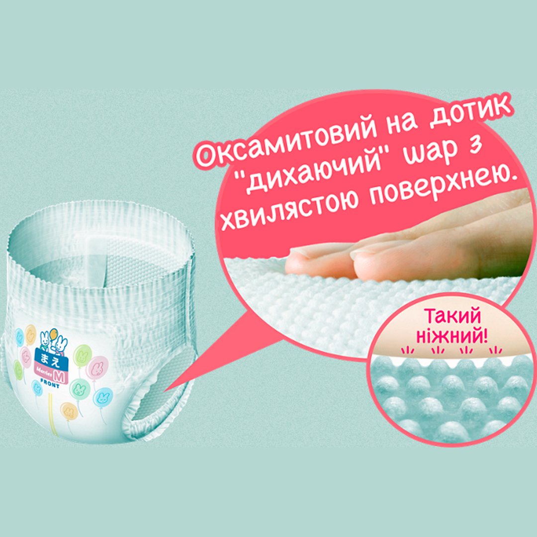 Підгузки на липучках для малюків від японського бренду Merries створені спеціально для делікатного піклування. Вони не подразнюють ніжну шкіру немовлят, забезпечують сухість та комфорт. Їх легко міняти. Вони не пережимають животик і не заважають руху. Добре сидять по фігурі. Завдяки хвилястій, дуже м'якій поверхні шару з пористою структурою підгузник відмінно пропускає повітря. Волога виводиться через численні пори внутрішньої поверхні. Але повітряні мікроканали пропускають лише піт - нічого більше! Рідкі випорожнення надійно утримують дрібні чарунки, розташовані з боків хвилястого шару. Рідкий стілець швидко поглинають більші комірки, розташовані по центру. Отже, ніяких протікань не буде! Полімер, який використовується при виробництві підгузників Меріес, здатний ввібрати об'єм рідини, що у 200-300 разів перевищує його власний. У оновлених трусиків щільно прилеглі м'які оборочки тягнуться у 2,5 рази краще.