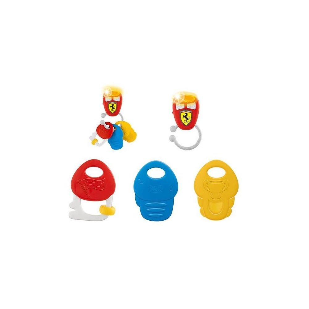 Музична іграшка Chicco у вигляді зв'язки ключів від машини. Завдяки кільцю-утримувачу її зручно брати з собою. Вона легко кріпиться до коляски, автокрісла або ліжечка. На кільці - 3 знімні різні за формою та кольором ключики. Прогумований матеріал та текстура дозволяє використовувати їх в якості прорізувача для зубів. Є 2 кнопки, що активують звуки автомобіля та 4 мелодії. Під час гри світиться лампочка. Для роботи потрібні 3 батарейки А76. Іграшка розвиває дрібну моторику, уяву, логіку та асоціативні навички. Рекомендовано від 3 до 18 місяців.